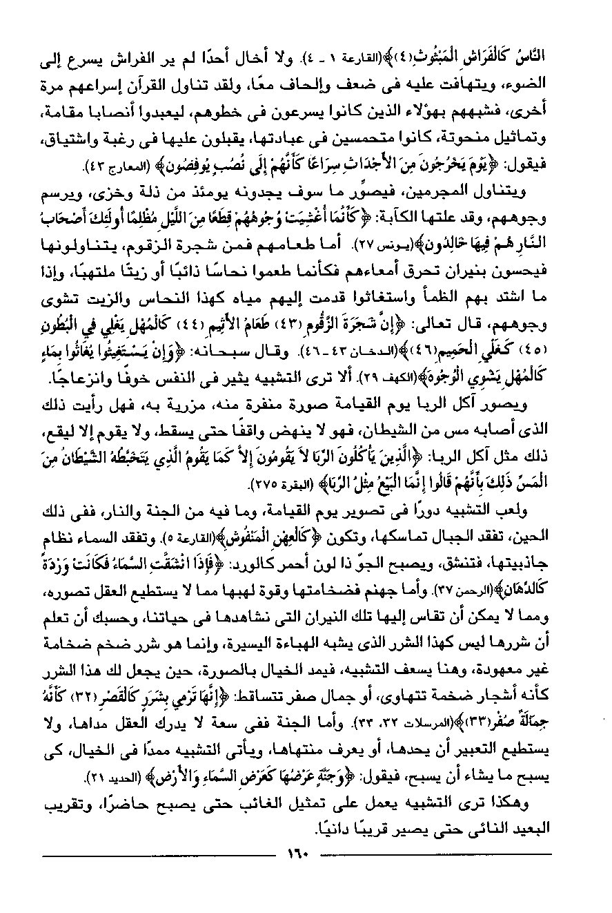 النَّاسُ كَالْفَراشِ الْمَبْثُوثِ (4) (القارعة 1 - 4). ولا أخال أحدا لم ير الفراش يسرع إلى الضوء، ويتهافت عليه في ضعف وإلحاف معا، ولقد تناول القرآن إسراعهم مرة أخرى، فشبههم بهؤلاء الذين كانوا يسرعون في خطوهم، ليعبدوا أنصابا مقامة، وتماثيل منحوتة، كانوا متحمسين في عبادتها، يقبلون عليها في رغبة واشتياق، فيقول: يَوْمَ يَخْرُجُونَ مِنَ الْأَجْداثِ سِراعاً كَأَنَّهُمْ إِلى نُصُبٍ يُوفِضُونَ (المعارج 43).