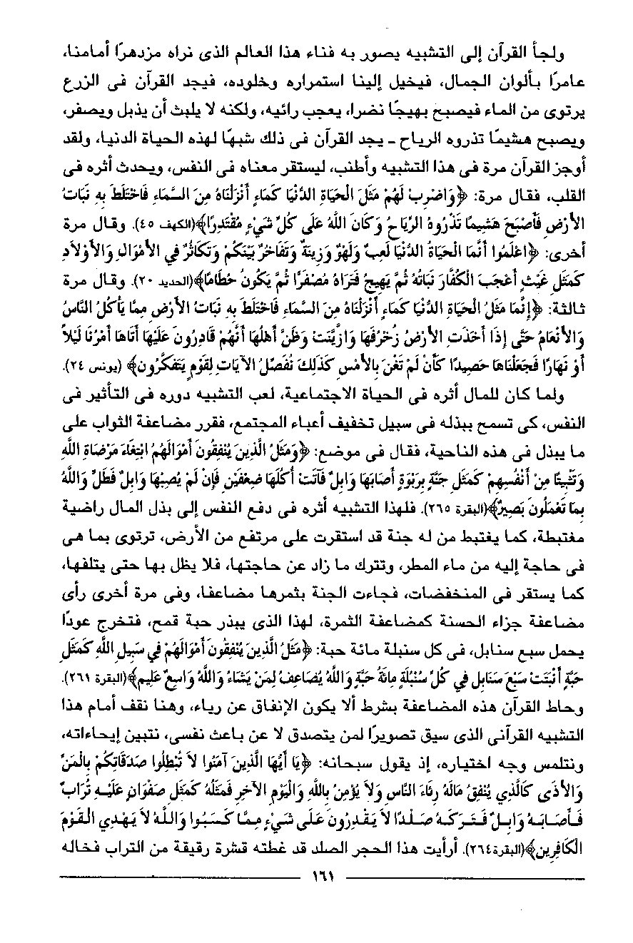 ولما كان للمال أثره في الحياة الاجتماعية، لعب التشبيه دوره في التأثير في النفس، كى تسمح ببذله في سبيل تخفيف أعباء المجتمع، فقرر مضاعفة الثواب على ما يبذل في هذه الناحية، فقال في موضع: وَمَثَلُ الَّذِينَ يُنْفِقُونَ أَمْوالَهُمُ ابْتِغاءَ مَرْضاتِ اللَّهِ وَتَثْبِيتاً مِنْ أَنْفُسِهِمْ كَمَثَلِ جَنَّةٍ بِرَبْوَةٍ أَصابَها وابِلٌ فَآتَتْ أُكُلَها ضِعْفَيْنِ فَإِنْ لَمْ يُصِبْها وابِلٌ فَطَلٌّ وَاللَّهُ بِما تَعْمَلُونَ بَصِيرٌ (البقرة 265). فلهذا التشبيه أثره في دفع النفس إلى بذل المال راضية مغتبطة، كما يغتبط من له جنة قد استقرت على مرتفع من الأرض، ترتوى بما هى فى حاجة إليه من ماء المطر، وتترك ما زاد عن حاجتها، فلا يظل بها حتى يتلفها، كما يستقر في المنخفضات، فجاءت الجنة بثمرها مضاعفا، وفي مرة أخرى رأى مضاعفة جزاء الحسنة كمضاعفة الثمرة، لهذا الذى يبذر حبة قمح، فتخرج عودا يحمل سبع سنابل، فى كل سنبلة مائة حبة: مَثَلُ الَّذِينَ يُنْفِقُونَ أَمْوالَهُمْ فِي سَبِيلِ اللَّهِ كَمَثَلِ حَبَّةٍ أَنْبَتَتْ سَبْعَ سَنابِلَ فِي كُلِّ سُنْبُلَةٍ مِائَةُ حَبَّةٍ وَاللَّهُ يُضاعِفُ لِمَنْ يَشاءُ وَاللَّهُ واسِعٌ عَلِيمٌ (البقرة 261).