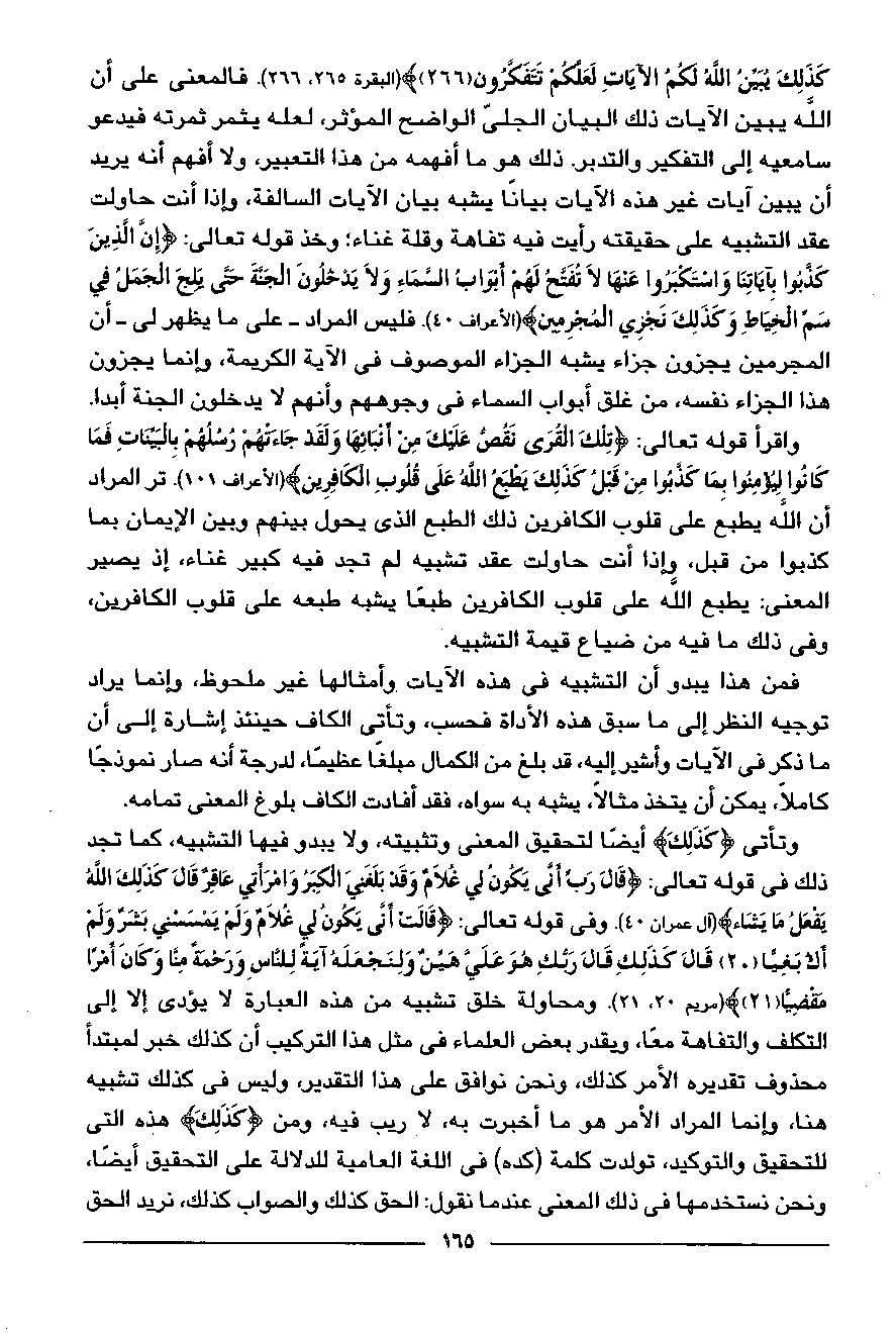 كَذلِكَ يُبَيِّنُ اللَّهُ لَكُمُ الْآياتِ لَعَلَّكُمْ تَتَفَكَّرُونَ (266) (البقرة 265، 266). فالمعنى على أن الله يبين الآيات ذلك البيان الجلىّ الواضح المؤثر، لعله يثمر ثمرته فيدعو سامعيه إلى التفكير والتدبر. ذلك هو ما أفهمه من هذا التعبير، ولا أفهم أنه يريد أن يبين آيات غير هذه الآيات بيانا يشبه بيان الآيات السالفة، وإذا أنت حاولت عقد التشبيه على حقيقته رأيت فيه تفاهة وقلة غناء؛ وخذ قوله تعالى: إِنَّ الَّذِينَ كَذَّبُوا بِآياتِنا وَاسْتَكْبَرُوا عَنْها لا تُفَتَّحُ لَهُمْ أَبْوابُ السَّماءِ وَلا يَدْخُلُونَ الْجَنَّةَ حَتَّى يَلِجَ الْجَمَلُ فِي سَمِّ الْخِياطِ وَكَذلِكَ نَجْزِي الْمُجْرِمِينَ (الأعراف 40). فليس المراد- على ما يظهر لى- أن المجرمين يجزون جزاء يشبه الجزاء الموصوف في الآية الكريمة، وإنما يجزون هذا الجزاء نفسه، من غلق أبواب السماء في وجوههم وأنهم لا يدخلون الجنة أبدا.
