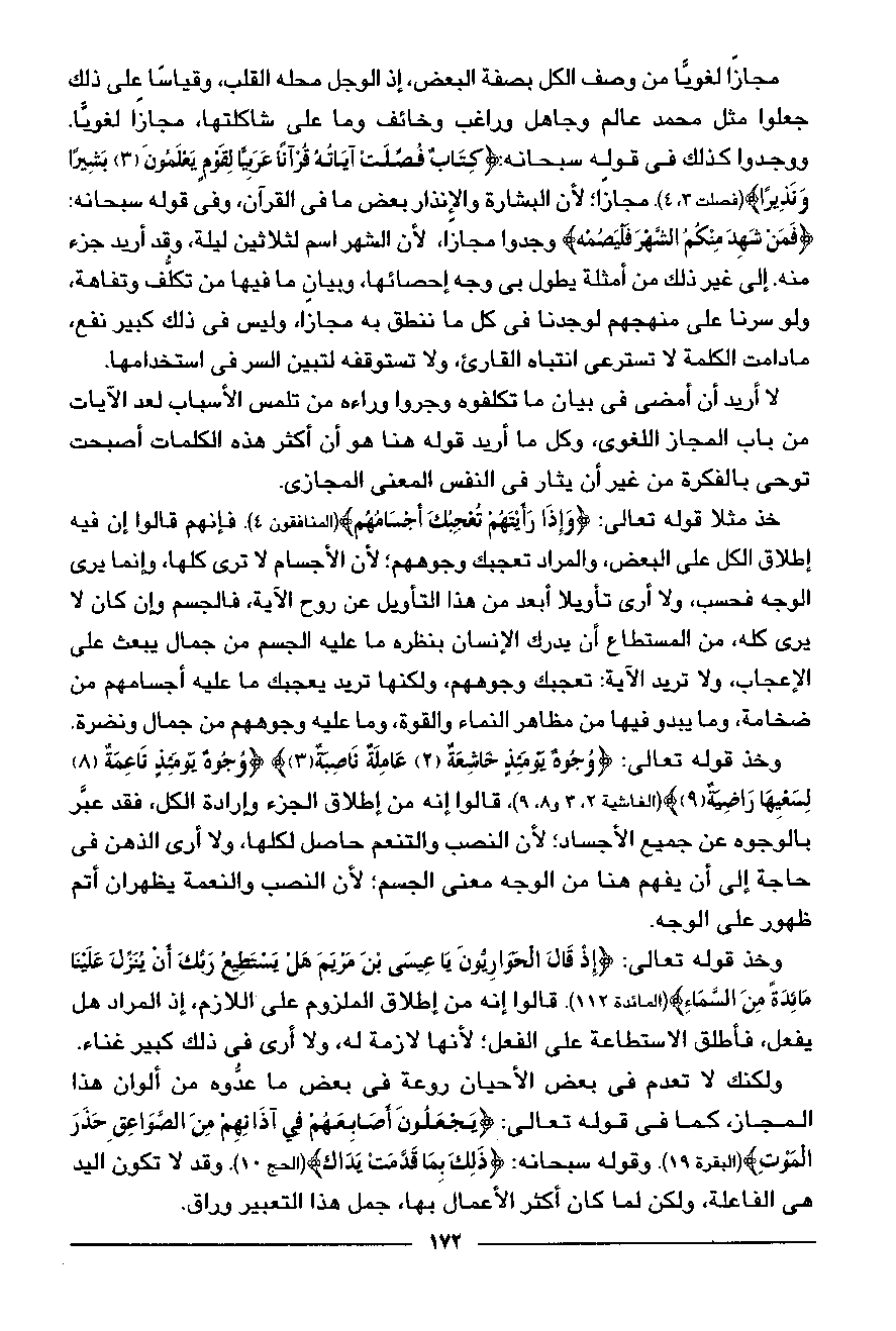 وخذ قوله تعالى: وُجُوهٌ يَوْمَئِذٍ خاشِعَةٌ (2) عامِلَةٌ ناصِبَةٌ (3) وُجُوهٌ يَوْمَئِذٍ ناعِمَةٌ (8) لِسَعْيِها راضِيَةٌ (9) (الغاشية 2، 3 و 8، 9)، قالوا إنه من إطلاق الجزء وإرادة الكل، فقد عبّر بالوجوه عن جميع الأجساد؛ لأن النصب والتنعم حاصل لكلها، ولا أرى الذهن في حاجة إلى أن يفهم هنا من الوجه معنى الجسم؛ لأن النصب والنعمة يظهران أتم ظهور على الوجه.