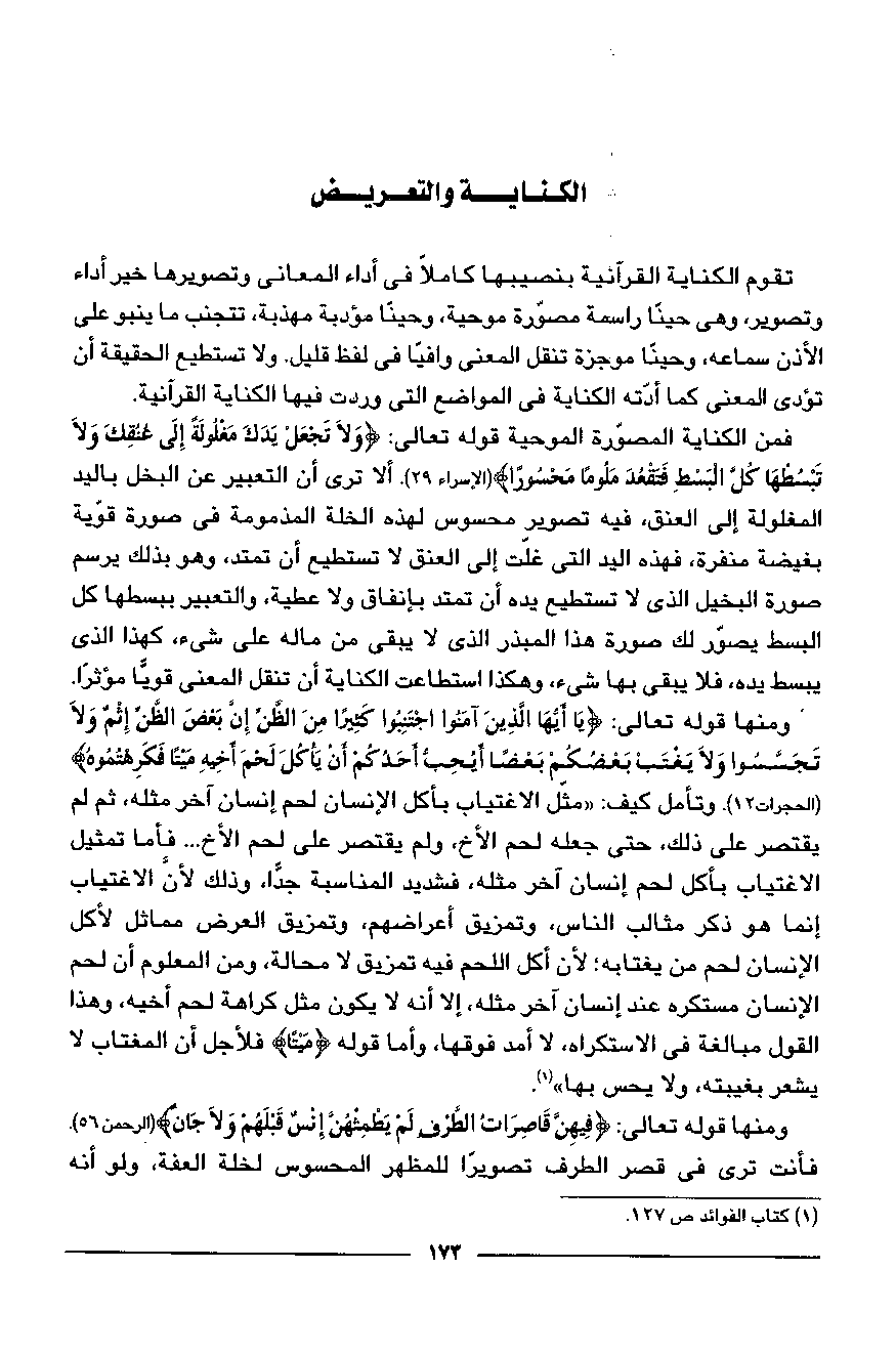فمن الكناية المصوّرة الموحية قوله تعالى: وَلا تَجْعَلْ يَدَكَ مَغْلُولَةً إِلى عُنُقِكَ وَلا تَبْسُطْها كُلَّ الْبَسْطِ فَتَقْعُدَ مَلُوماً مَحْسُوراً (الإسراء 29). ألا ترى أن التعبير عن البخل باليد المغلولة إلى العنق، فيه تصوير محسوس لهذه الخلة المذمومة في صورة قوّية بغيضة منفرة، فهذه اليد التى غلّت إلى العنق لا تستطيع أن تمتد، وهو بذلك يرسم صورة البخيل الذى لا تستطيع يده أن تمتد بإنفاق ولا عطية، والتعبير ببسطها كل البسط يصوّر لك صورة هذا المبذر الذى لا يبقى من ماله على شىء، كهذا الذى يبسط يده، فلا يبقى بها شىء، وهكذا استطاعت الكناية أن تنقل المعنى قويّا مؤثرا.