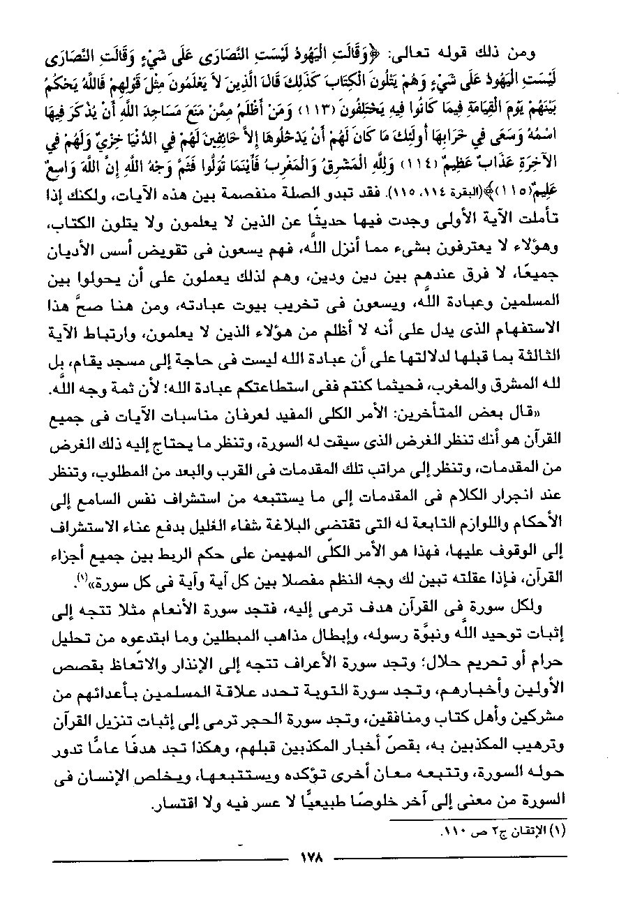 ومن ذلك قوله تعالى: وَقالَتِ الْيَهُودُ لَيْسَتِ النَّصارى عَلى شَيْءٍ وَقالَتِ النَّصارى لَيْسَتِ الْيَهُودُ عَلى شَيْءٍ وَهُمْ يَتْلُونَ الْكِتابَ كَذلِكَ قالَ الَّذِينَ لا يَعْلَمُونَ مِثْلَ قَوْلِهِمْ فَاللَّهُ يَحْكُمُ بَيْنَهُمْ يَوْمَ الْقِيامَةِ فِيما كانُوا فِيهِ يَخْتَلِفُونَ (113) وَمَنْ أَظْلَمُ مِمَّنْ مَنَعَ مَساجِدَ اللَّهِ أَنْ يُذْكَرَ فِيهَا اسْمُهُ وَسَعى فِي خَرابِها أُولئِكَ ما كانَ لَهُمْ أَنْ يَدْخُلُوها إِلَّا خائِفِينَ لَهُمْ فِي الدُّنْيا خِزْيٌ وَلَهُمْ فِي الْآخِرَةِ عَذابٌ عَظِيمٌ (114) وَلِلَّهِ الْمَشْرِقُ وَالْمَغْرِبُ فَأَيْنَما تُوَلُّوا فَثَمَّ وَجْهُ اللَّهِ إِنَّ اللَّهَ واسِعٌ عَلِيمٌ (115) (البقرة 114، 115). فقد تبدو الصلة منفصمة بين هذه الآيات، ولكنك إذا تأملت الآية الأولى وجدت فيها حديثا عن الذين لا يعلمون ولا يتلون الكتاب، وهؤلاء لا يعترفون بشيء مما أنزل الله، فهم يسعون في تقويض أسس الأديان جميعا، لا فرق عندهم بين دين ودين، وهم لذلك يعملون على أن يحولوا بين المسلمين وعبادة الله، ويسعون في تخريب بيوت عبادته، ومن هنا صحّ هذا الاستفهام الذى يدل على أنه لا أظلم من هؤلاء الذين لا يعلمون، وارتباط الآية الثالثة بما قبلها لدلالتها على أن عبادة الله ليست في حاجة إلى مسجد يقام، بل لله المشرق والمغرب، فحيثما كنتم ففي استطاعتكم عبادة الله؛ لأن ثمة وجه الله.