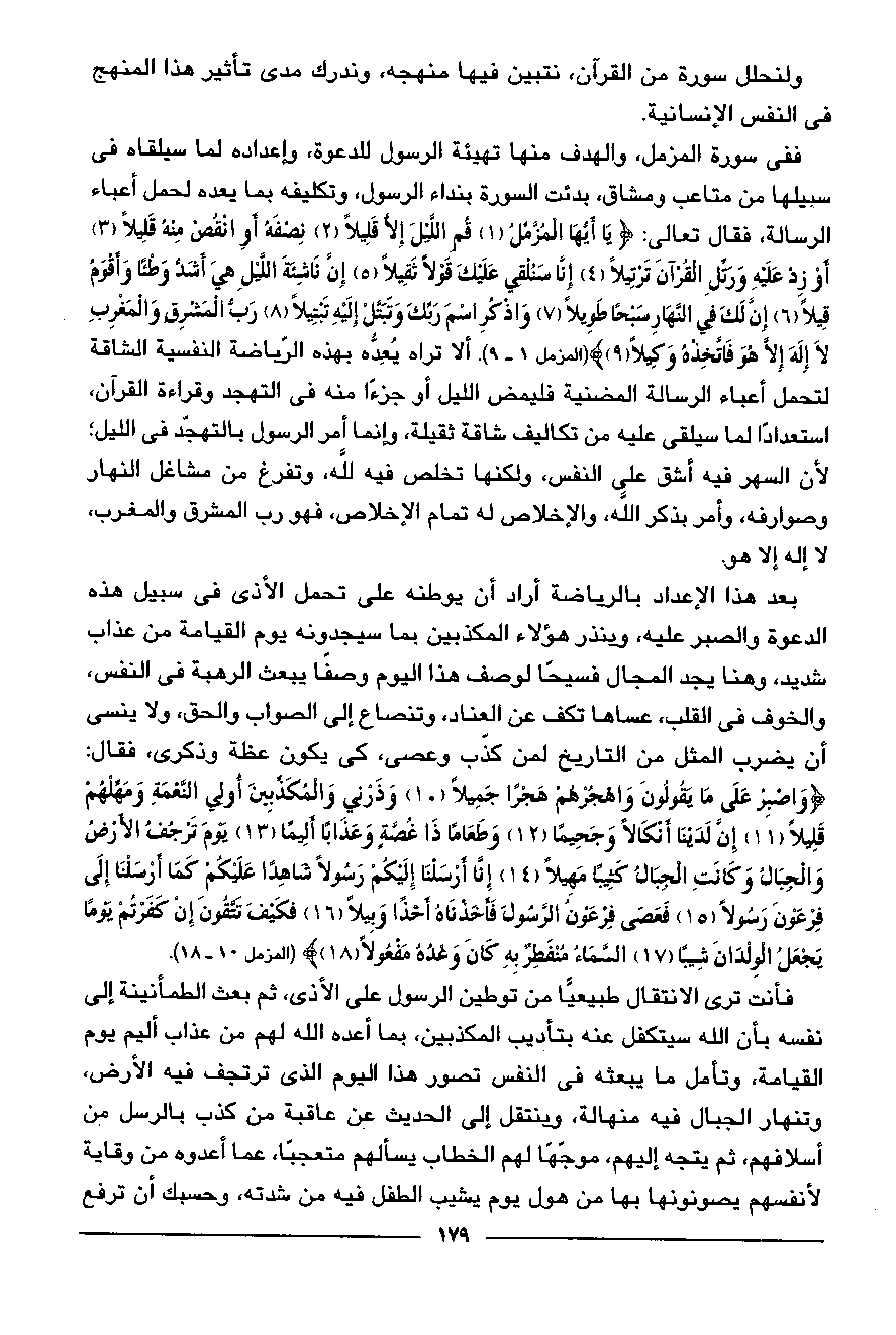 ففي سورة المزمل، والهدف منها تهيئة الرسول للدعوة، وإعداده لما سيلقاه في سبيلها من متاعب ومشاق، بدئت السورة بنداء الرسول، وتكليفه بما يعده لحمل أعباء الرسالة، فقال تعالى: يا أَيُّهَا الْمُزَّمِّلُ (1) قُمِ اللَّيْلَ إِلَّا قَلِيلًا (2) نِصْفَهُ أَوِ انْقُصْ مِنْهُ قَلِيلًا (3) أَوْ زِدْ عَلَيْهِ وَرَتِّلِ الْقُرْآنَ تَرْتِيلًا (4) إِنَّا سَنُلْقِي عَلَيْكَ قَوْلًا ثَقِيلًا (5) إِنَّ ناشِئَةَ اللَّيْلِ هِيَ أَشَدُّ وَطْئاً وَأَقْوَمُ قِيلًا (6) إِنَّ لَكَ فِي النَّهارِ سَبْحاً طَوِيلًا (7) وَاذْكُرِ اسْمَ رَبِّكَ وَتَبَتَّلْ إِلَيْهِ تَبْتِيلًا (8) رَبُّ الْمَشْرِقِ وَالْمَغْرِبِ لا إِلهَ إِلَّا هُوَ فَاتَّخِذْهُ وَكِيلًا (9) (المزمل 1 - 9). ألا تراه يعدّه بهذه الرّياضة النفسية الشاقة لتحمل أعباء الرسالة المضنية فليمض الليل أو جزءا منه في التهجد وقراءة القرآن، استعدادا لما سيلقى عليه من تكاليف شاقة ثقيلة، وإنما أمر الرسول بالتهجّد في الليل؛ لأن السهر فيه أشق على النفس، ولكنها تخلص فيه لله، وتفرغ من مشاغل النهار وصوارفه، وأمر بذكر الله، والإخلاص له تمام الإخلاص، فهو رب المشرق والمغرب، لا إله إلا هو.