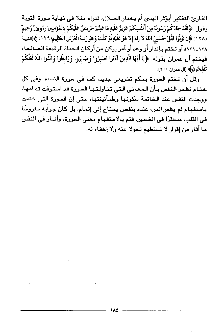 القارئ التفكير أيؤثر الهدى أم يختار الضلال، فتراه مثلا في نهاية سورة التوبة يقول: لَقَدْ جاءَكُمْ رَسُولٌ مِنْ أَنْفُسِكُمْ عَزِيزٌ عَلَيْهِ ما عَنِتُّمْ حَرِيصٌ عَلَيْكُمْ بِالْمُؤْمِنِينَ رَؤُفٌ رَحِيمٌ (128) فَإِنْ تَوَلَّوْا فَقُلْ حَسْبِيَ اللَّهُ لا إِلهَ إِلَّا هُوَ عَلَيْهِ تَوَكَّلْتُ وَهُوَ رَبُّ الْعَرْشِ الْعَظِيمِ (129) (التوبة 128 - 129)، أو تختم بإنذار أو وعد أو أمر بركن من أركان الحياة الرفيعة الصالحة، فيختم آل عمران بقوله: يا أَيُّهَا الَّذِينَ آمَنُوا اصْبِرُوا وَصابِرُوا وَرابِطُوا وَاتَّقُوا اللَّهَ لَعَلَّكُمْ تُفْلِحُونَ (آل عمران 200).