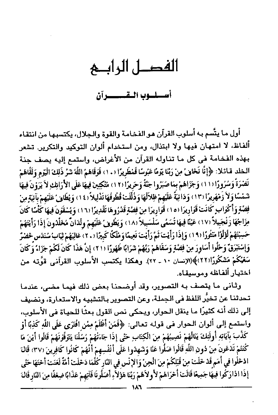 أول ما يتّسم به أسلوب القرآن هو الفخامة والقوة والجلال، يكتسبها من انتقاء ألفاظ، لا امتهان فيها ولا ابتذال، ومن استخدام ألوان التوكيد والتكرير. تشعر بهذه الفخامة في كل ما تناوله القرآن من الأغراض، واستمع إليه يصف جنة الخلد قائلا: إِنَّا نَخافُ مِنْ رَبِّنا يَوْماً عَبُوساً قَمْطَرِيراً (10) فَوَقاهُمُ اللَّهُ شَرَّ ذلِكَ الْيَوْمِ وَلَقَّاهُمْ نَضْرَةً وَسُرُوراً (11) وَجَزاهُمْ بِما صَبَرُوا جَنَّةً وَحَرِيراً (12) مُتَّكِئِينَ فِيها عَلَى الْأَرائِكِ لا يَرَوْنَ فِيها شَمْساً وَلا زَمْهَرِيراً (13) وَدانِيَةً عَلَيْهِمْ ظِلالُها وَذُلِّلَتْ قُطُوفُها تَذْلِيلًا (14) وَيُطافُ عَلَيْهِمْ بِآنِيَةٍ مِنْ فِضَّةٍ وَأَكْوابٍ كانَتْ قَوارِيرَا (15) قَوارِيرَا مِنْ فِضَّةٍ قَدَّرُوها تَقْدِيراً (16) وَيُسْقَوْنَ فِيها كَأْساً كانَ مِزاجُها زَنْجَبِيلًا (17) عَيْناً فِيها تُسَمَّى سَلْسَبِيلًا (18) وَيَطُوفُ عَلَيْهِمْ وِلْدانٌ مُخَلَّدُونَ إِذا رَأَيْتَهُمْ حَسِبْتَهُمْ لُؤْلُؤاً مَنْثُوراً (19) وَإِذا رَأَيْتَ ثَمَّ رَأَيْتَ نَعِيماً وَمُلْكاً كَبِيراً (20) عالِيَهُمْ ثِيابُ سُندُسٍ خُضْرٌ وَإِسْتَبْرَقٌ وَحُلُّوا أَساوِرَ مِنْ فِضَّةٍ وَسَقاهُمْ رَبُّهُمْ شَراباً طَهُوراً (21) إِنَّ هذا كانَ لَكُمْ جَزاءً وَكانَ سَعْيُكُمْ مَشْكُوراً (22) (الإنسان 10 - 22). وهكذا يكتسب الأسلوب القرآنى قوّته من اختيار ألفاظه وموسيقاه.