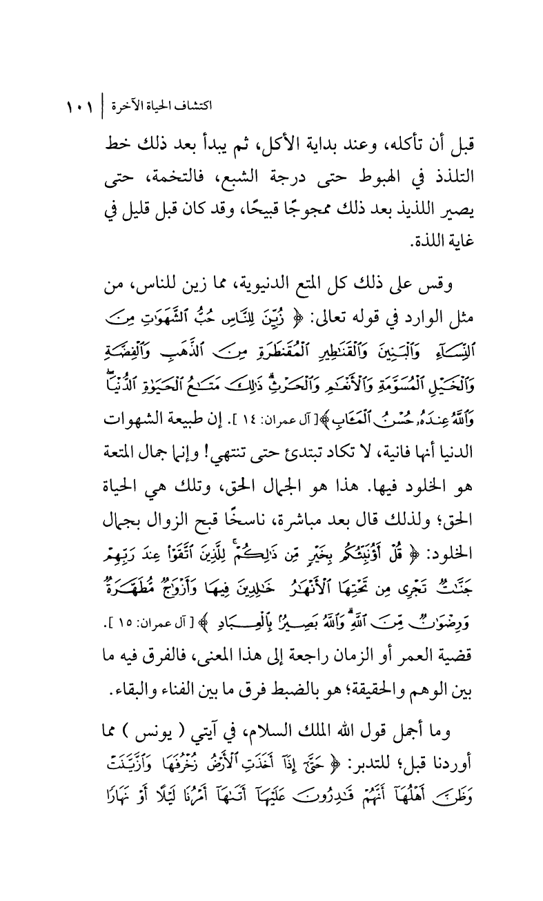 وقس على ذلك كل المتع الدنيوية، مما زين للناس، من مثل الوارد في قوله تعالى: {زُيِّنَ لِلنَّاسِ حُبُّ الشَّهَوَاتِ مِنَ النِّسَاء وَالْبَنِينَ وَالْقَنَاطِيرِ الْمُقَنطَرَةِ مِنَ الذَّهَبِ وَالْفِضَّةِ وَالْخَيْلِ الْمُسَوَّمَةِ وَالأَنْعَامِ وَالْحَرْثِ ذَلِكَ مَتَاعُ الْحَيَاةِ الدُّنْيَا وَاللهُ عِندَهُ حُسْنُ الْمَآبِ} [آل عمران:14]. إن طبيعة الشهوات الدنيا أنها فانية، لا تكاد تبتدئ حتى تنتهي! وإنما جمال المتعة هو الخلود فيها. هذا هو الجمال الحق، وتلك هي الحياة الحق؛ ولذلك قال بعد مباشرة، ناسخاً قبح الزوال بجمال الخلود: {قُلْ أَؤُنَبِّئُكُم بِخَيْرٍ مِّن ذَلِكُمْ لِلَّذِينَ اتَّقَوْا عِندَ رَبِّهِمْ جَنَّاتٌ تَجْرِي مِن تَحْتِهَا الأَنْهَارُ خَالِدِينَ فِيهَا وَأَزْوَاجٌ مُّطَهَّرَةٌ وَرِضْوَانٌ مِّنَ اللهِ وَاللهُ بَصِيرٌ بِالْعِبَادِ} [آل عمران:15]. قضية العمر أو الزمان راجعة إلى هذا المعنى، فالفرق فيه ما بين الوهم والحقيقة؛ هو بالضبط فرق ما بين الفناء والبقاء.
