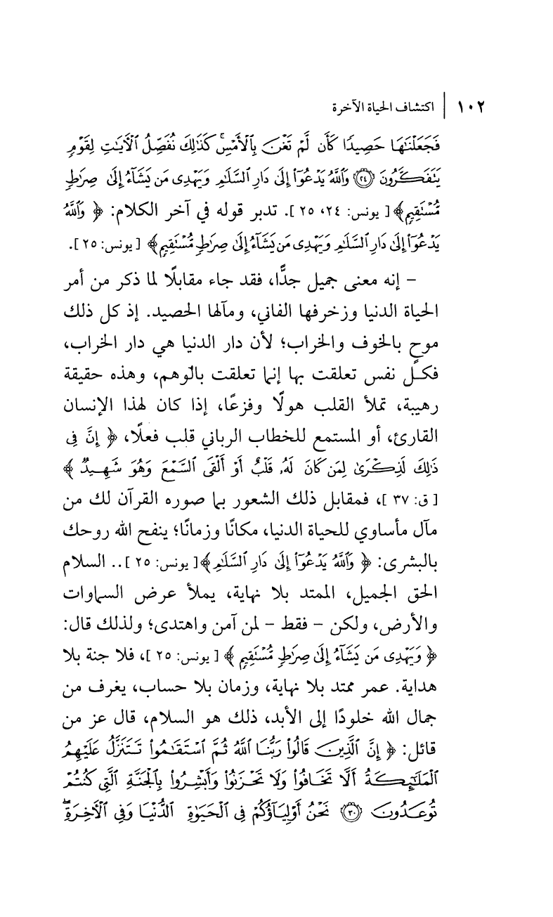 - إنه معنى جميل جدّاً، فقد جاء مقابلاً لما ذكر من أمر الحياة الدنيا وزخرفها الفاني، ومآلها الحصيد. إذ كل ذلك موحٍ بالخوف والخراب؛ لأن دار الدنيا هي دار الخراب، فكل نفس تعلقت بها إنما تعلقت بالوهم، وهذه حقيقة رهيبة، تملأ القلب هولاً وفزعاً، إذا كان لهذا الإنسان القارئ، أو المستمع للخطاب الرباني قلب فعلاً، {إِنَّ فِي ذَلِكَ لَذِكْرَى لِمَن كَانَ لَهُ قَلْبٌ أَوْ أَلْقَى السَّمْعَ وَهُوَ شَهِيدٌ} [ق:37]، فمقابل ذلك الشعور بما صوره القرآن لك من مآل مأساوي للحياة الدنيا، مكاناً وزماناً؛ ينفح الله روحك بالبشرى: {وَالله يَدْعُو إِلَى دَارِ السَّلاَمِ} [يونس:25] .. السلام الحق الجميل، الممتد بلا نهاية، يملأ عرض السماوات والأرض، ولكن -فقط- لمن آمن واهتدى؛ ولذلك قال: {وَيَهْدِي مَن يَشَاء إِلَى صِرَاطٍ مُّسْتَقِيمٍ} [يونس:25]. فلا جنة بلا هداية. عمر ممتد بلا نهاية، وزمان بلا حساب، يغرف من جمال الله خلوداً إلى الأبد، ذلك هو السلام، قال عز من قائل: {إنَّ الَّذِينَ قَالُوا رَبُّنَا اللَّهُ ثُمَّ اسْتَقَامُوا تَتَنَزَّلُ عَلَيْهِمُ الْمَلَائِكَةُ أَلَّا تَخَافُوا وَلَا تَحْزَنُوا وَأَبْشِرُوا بِالْجَنَّةِ الَّتِي كُنتُمْ تُوعَدُونَ. نَحْنُ أَوْلِيَاؤُكُمْ فِي الْحَيَاةِ الدُّنْيَا وَفِي الْآخِرَةِ
