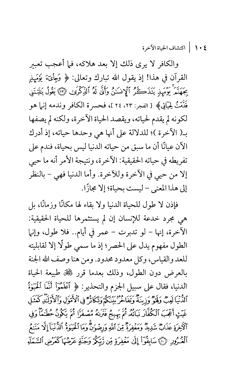 والكافر لا يرى ذلك إلا بعد هلاكه، فما أعجب تعبير القرآن في هذا! إذ يقول الله تبارك وتعالى: {وَجِيءَ يَوْمَئِذٍ بِجَهَنَّمَ يَوْمَئِذٍ يَتَذَكَّرُ الْإِنسَانُ وَأَنَّى لَهُ الذِّكْرَى. يَقُولُ يَا لَيْتَنِي قَدَّمْتُ لِحَيَاتِي} [الفجر:23،24]، فحسرة الكافر وندمه إنما هو لكونه لم يقدم لحياته، ويقصد الحياة الآخرة، ولكنه لم يصفها بـ (الآخرة)؛ للدلالة على أنها هي وحدها حياته، إذ أدرك الآن عياناً أن ما سبق من حياته الدنيا ليس بحياة، فندم على تفريطه في حياته الحقيقية: الآخرة، ونتيجة الأمر أنه ما حيي إلا من حيي في الآخرة وللآخرة. وأما الدنيا فهي -بالنظر إلى هذا المعنى- ليست بحياة؛ إلا مجازاً.