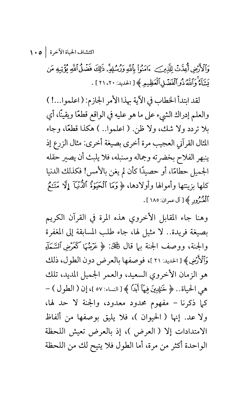 وهنا جاء المقابل الأخروي هذه المرة في القرآن الكريم بصيغة فريدة .. لا مثيل لها، جاء طلب المسابقة إلى المغفرة والجنة، ووصف الجنة بما قال عز وجل: {عَرْضُهَا كَعَرْضِ السَّمَاءِ وَالْأَرْضِ} [الحديد:21]، فوصفها بالعرض دون الطول، ذلك هو الزمان الأخروي السعيد، والعمر الجميل المديد، تلك هي الحياة .. {خَالِدِينَ فِيهَا أَبَدًا} [النساء:57]، إن (الطول) -كما ذكرنا- مفهوم محدود معدود، والجنة لا حد لها، ولا عد. إنها (الحيوان)، فلا يليق بوصفها من ألفاظ الامتدادات إلا (العرض)، إذ بالعرض تعيش اللحظة الواحدة أكثر من مرة، أما الطول فلا يتيح لك من اللحظة