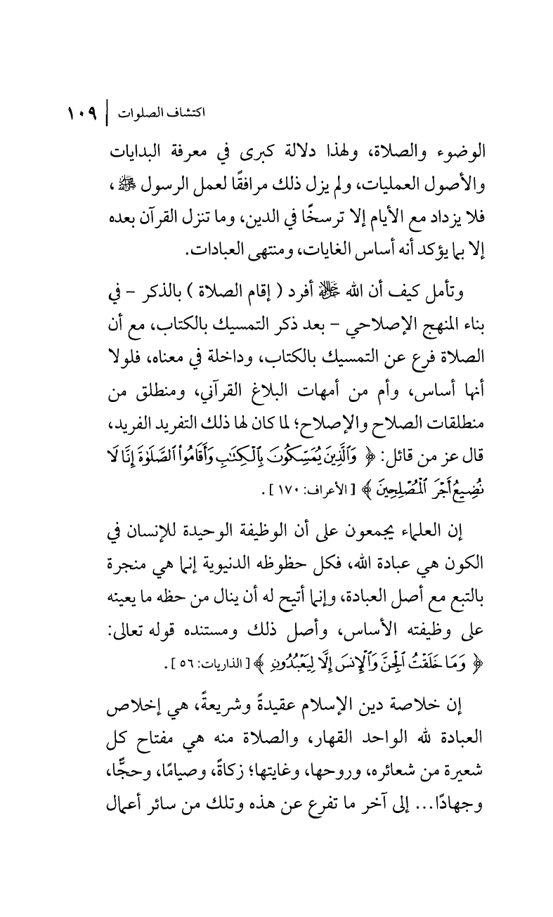 وتأمل كيف أن الله جل جلاله أفرد (إقام الصلاة) بالذكر -في بناء المنهج الإصلاحي- بعد ذكر التمسيك بالكتاب، مع أن الصلاة فرع عن التمسيك بالكتاب، وداخلة في معناه، فلولا أنها أساس، وأم من أمهات البلاغ القرآني، ومنطلق من منطلقات الصلاح والإصلاح؛ لما كان لها ذلك التفريد الفريد، قال عز من قائل: {وَالَّذِينَ يُمَسِّكُونَ بِالْكِتَابِ وَأَقَامُوا الصَّلاَةَ إِنَّا لاَ نُضِيعُ أَجْرَ الْمُصْلِحِينَ} [الأعراف:170].