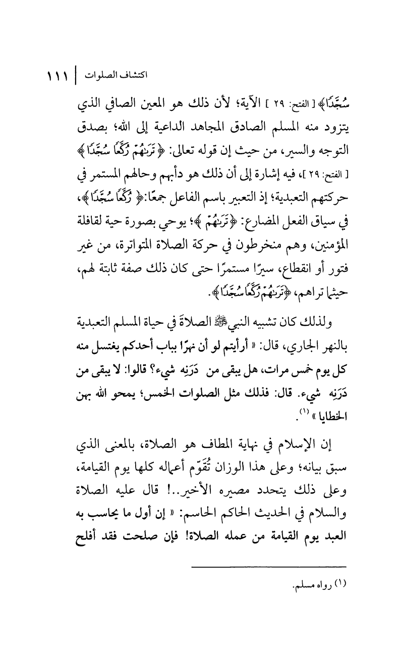 ولذلك كان تشبيه النبي صلى الله عليه وسلم الصلاةَ في حياة المسلم التعبدية بالنهر الجاري، قال: «أرأيتم لو أن نهراً بباب أحدكم يغتسل منه كل يوم خمس مرات، هل يبقى من دَرَنِه شيء؟ قالوا: لا يبقى من دَرَنِه شيء. قال: فذلك مثل الصلوات الخمس؛ يمحو الله بهن الخطايا» (¬1).