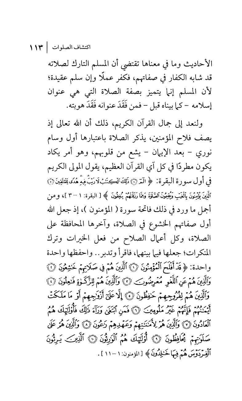 ولنعد إلى جمال القرآن الكريم، ذلك أن الله تعالى إذ يصف فلاح المؤمنين؛ يذكر الصلاة باعتبارها أول وسام نوري -بعد الإيمان- يشع من قلوبهم، وهو أمر يكاد يكون مطرداً في كل آي القرآن العظيم، يقول المولى الكريم في أول سورة البقرة: {الم. ذَلِكَ الْكِتَابُ لاَ رَيْبَ فِيهِ هُدًى لِّلْمُتَّقِينَ. الَّذِينَ يُؤْمِنُونَ بِالْغَيْبِ وَيُقِيمُونَ الصَّلاةَ وَمِمَّا رَزَقْنَاهُمْ يُنفِقُونَ} [البقرة:1 - 3]، ومن أجمل ما ورد في ذلك فاتحة سورة (المؤمنون)، إذ جعل الله أول صفاتهم الخشوع في الصلاة، وآخرها المحافظة على الصلاة، وكل أعمال الصلاح من فعل الخيرات وترك المنكرات؛ جعلها فيما بينهما، فاقرأ وتدبر .. واحفظها واحدة واحدة: {قَدْ أَفْلَحَ الْمُؤْمِنُونَ. الَّذِينَ هُمْ فِي صَلَاتِهِمْ خَاشِعُونَ. وَالَّذِينَ هُمْ عَنِ اللَّغْوِ مُعْرِضُونَ. وَالَّذِينَ هُمْ لِلزَّكَاةِ فَاعِلُونَ. وَالَّذِينَ هُمْ لِفُرُوجِهِمْ حَافِظُونَ. إِلَّا عَلَى أَزْوَاجِهِمْ أوْ مَا مَلَكَتْ أَيْمَانُهُمْ فَإِنَّهُمْ غَيْرُ مَلُومِينَ. فَمَنِ ابْتَغَى وَرَاء ذَلِكَ فَأُوْلَئِكَ هُمُ الْعَادُونَ. وَالَّذِينَ هُمْ لِأَمَانَاتِهِمْ وَعَهْدِهِمْ رَاعُونَ. وَالَّذِينَ هُمْ عَلَى صَلَوَاتِهِمْ يُحَافِظُونَ. أُوْلَئِكَ هُمُ الْوَارِثُونَ. الَّذِينَ يَرِثُونَ الْفِرْدَوْسَ هُمْ فِيهَا خَالِدُونَ} [المؤمنون:1 - 11].