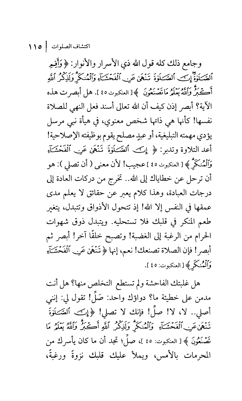وجامع ذلك كله قول الله ذي الأسرار والأنوار: {وَأَقِمِ الصَّلَاةَ إِنَّ الصَّلَاةَ تَنْهَى عَنِ الْفَحْشَاء وَالْمُنكَرِ وَلَذِكْرُ اللَّهِ أَكْبَرُ وَاللَّهُ يَعْلَمُ مَا تَصْنَعُونَ} [العنكبوت:45]. هل أبصرت هذه الآية؟ أبصر إذن كيف أن الله تعالى أسند فعل النهي للصلاة نفسها! كأنها هي ذاتها شخص معنوي، في هيأة نبي مرسل يؤدي مهمته التبليغية، أو عبدٍ مصلح يقوم بوظيفته الإصلاحية! أعد التلاوة وتدبر: {إِنَّ الصَّلَاةَ تَنْهَى عَنِ الْفَحْشَاء وَالْمُنكَرِ} [العنكبوت:45] عجيب! لأن معنى (أن تصلي): هو أن ترحل عن خطاياك إلى الله .. تخرج من دركات العادة إلى درجات العبادة، وهذا كلام يعبر عن حقائق لا يعلم مدى عمقها في النفس إلا الله! إذ تتحول الأذواق وتتبدل، يتغير طعم المنكر في قلبك فلا تستحليه. ويتبدل ذوق شهوات الحرام من الرغبة إلى الغضبة! وتصبح خلقاً آخر! أبصر ثم أبصر! فإن الصلاة تصنعك! نعم، إنها {تَنْهَى عَنِ الْفَحْشَاء وَالْمُنكَرِ} [العنكبوت:45].