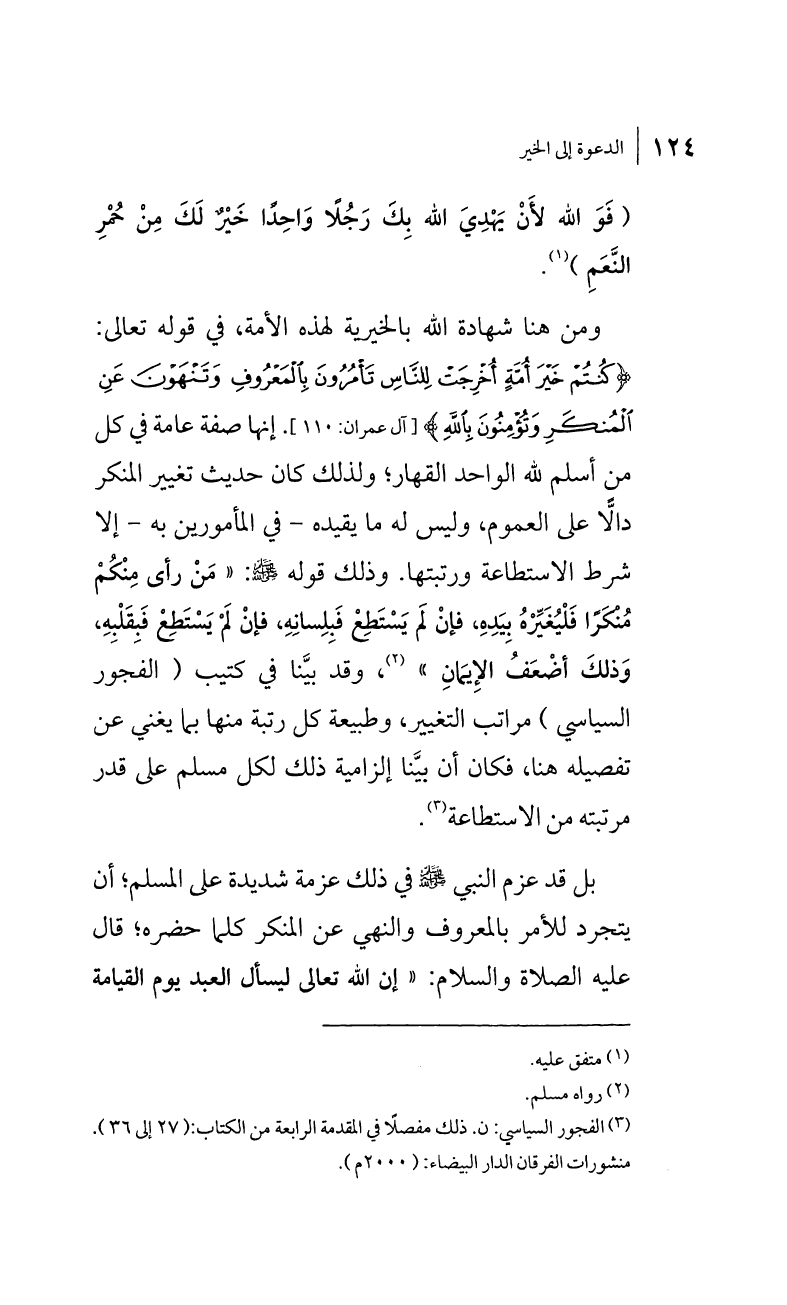 ومن هنا شهادة الله بالخيرية لهذه الأمة، في قوله تعالى: {كُنتُمْ خَيْرَ أُمَّةٍ أُخْرِجَتْ لِلنَّاسِ تَامُرُونَ بِالْمَعْرُوفِ وَتَنْهَوْنَ عَنِ الْمُنكَرِ وَتُؤْمِنُونَ بِاللهِ} [آل عمران:110]. إنها صفة عامة في كل من أسلم لله الواحد القهار؛ ولذلك كان حديث تغيير المنكر دالّاً على العموم، وليس له ما يقيده -في المأمورين به- إلا شرط الاستطاعة ورتبتها. وذلك قوله صلى الله عليه وسلم: «مَنْ رأى مِنْكُمْ مُنْكَراً فَلْيُغَيِّرْهُ بِيَدِهِ، فإنْ لَم يَسْتَطِعْ فَبِلِسانِهِ، فإنْ لَمْ يَسْتَطِعْ فَبِقَلْبِهِ، وَذلكَ أضْعَفُ الإِيمَانِ» (¬2)، وقد بيَّنا في كتيب (الفجور السياسي) مراتب التغيير، وطبيعة كل رتبة منها بما يغني عن تفصيله هنا، فكان أن بيَّنا إلزامية ذلك لكل مسلم على قدر مرتبته من الاستطاعة (¬3).