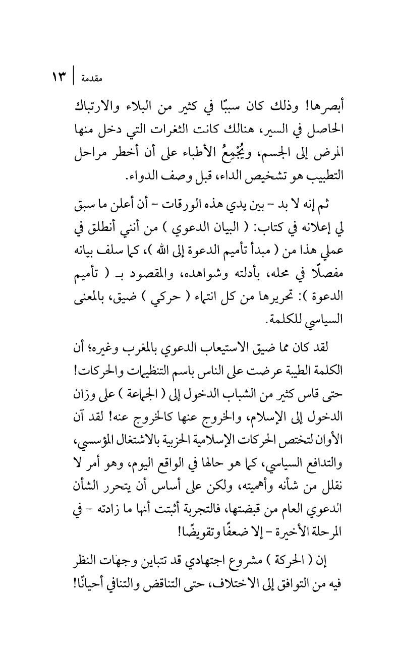 ثم إنه لابد -بين يدي هذه الورقات- أن أعلن ما سبق لي إعلانه في كتاب: (البيان الدعوي) من أنني أنطلق في عملي هذا من (مبدأ تأميم الدعوة إلى الله)، كما سلف بيانه مفصلاً في محله، بأدلته وشواهده، والمقصود بـ (تأميم الدعوة): تحريرها من كل انتماء (حركي) ضيق، بالمعنى السياسي للكلمة.
