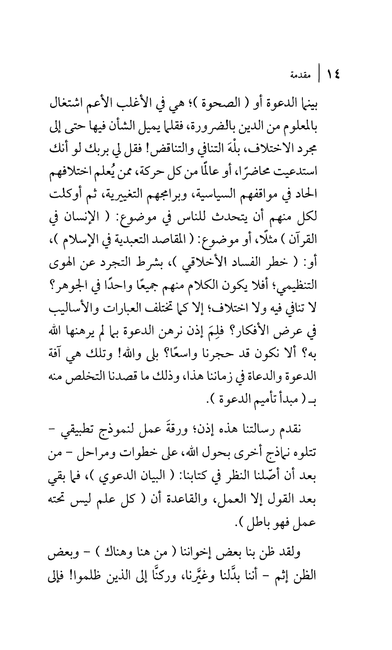 نقدم رسالتنا هذه إذن؛ ورقةَ عمل لنموذج تطبيقي -تتلوه نماذج أخرى بحول الله، على خطوات ومراحل- من بعد أن أصّلنا النظر في كتابنا: (البيان الدعوي)، فما بقي بعد القول إلا العمل، والقاعدة أن (كل علم ليس تحته عمل فهو باطل).