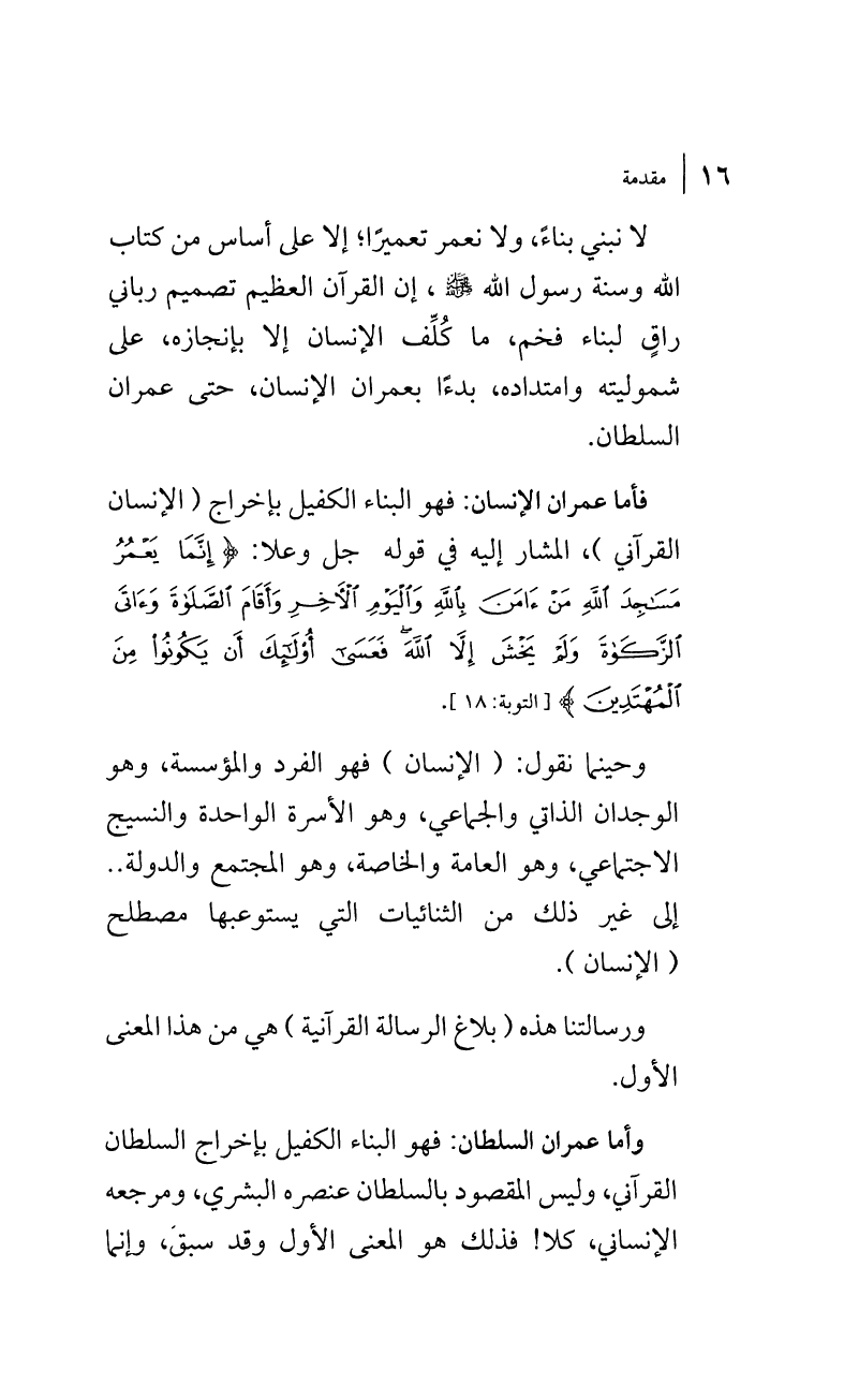 لا نبني بناءً، ولا نعمر تعميراً؛ إلا على أساس من كتاب الله وسنة رسول الله صلى الله عليه وسلم، إن القرآن العظيم تصميم رباني راقٍ؛ لبناء فخم، ما كُلِّف الإنسان إلا بإنجازه، على شموليته وامتداده، بدءاً بعمران الإنسان، حتى عمران السلطان.