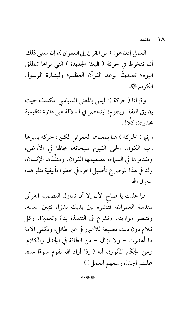 وإنما (الحركة) هنا بمعناها العمراني الكبير، حركة يديرها رب الكون، الحي القيوم سبحانه، مجالها في الأرض، وتقديرها في السماء، تصميمها القرآن، ومنفِّذها الإنسان، ولنا في هذا الموضوع تأصيل آخر، في خطوة تأليفية تتلو هذه بحول الله.