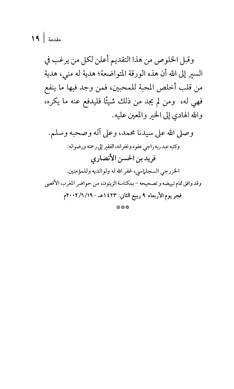 وقد وافق تمام تبييضه وتصحيحه -بمكناسة الزيتون، من حواضر المغرب الأقصى فجر يوم الأربعاء 9 ربيع الثاني: 1423 هـ - 19/ 6 /2002 م