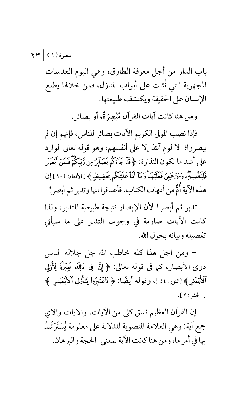 فإذ نصب المولى الكريم الآيات بصائر للناس، فإنهم إن لم يبصروا؛ لا لوم آنئذ إلا على أنفسهم، وهو قوله تعالى الوارد على أشد ما تكون النذارة: {قَدْ جَاءكُم بَصَآئِرُ مِن رَّبِّكُمْ فَمَنْ أَبْصَرَ فَلِنَفْسِهِ وَمَنْ عَمِيَ فَعَلَيْهَا وَمَا أَنَا عَلَيْكُم بِحَفِيظٍ} [الأنعام:104]، إن هذه الآية أُمٌّ من أمهات الكتاب. فأعد قراءتها وتدبر ثم أبصر!