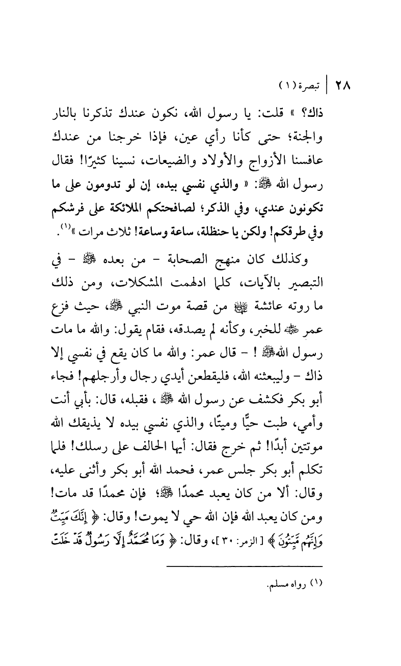 وكذلك كان منهج الصحابة -من بعده صلى الله عليه وسلم في التبصير بالآيات، كلما ادلهمت المشكلات، ومن ذلك ما روته عائشة رضي الله عنها من قصة موت النبي صلى الله عليه وسلم، حيث فزع عمر رضي الله عنه للخبر، وكأنه لم يصدقه، فقام يقول: والله ما مات رسول الله! صلى الله عليه وسلم قال عمر: والله ما كان يقع في نفسي إلا ذاك- وليبعثنه الله، فليقطعن أيدي رجال وأرجلهم! فجاء أبو بكر فكشف عن رسول الله صلى الله عليه وسلم، فقبله، قال: بأبي أنت وأمي، طبت حيّاً وميتاً، والذي نفسي بيده لا يذيقك الله موتتين أبداً! ثم خرج فقال: أيها الحالف على رسلك! فلما تكلم أبو بكر جلس عمر، فحمد الله أبو بكر وأثنى عليه، وقال: ألا من كان يعبد محمداً صلى الله عليه وسلم؛ فإن محمداً قد مات! ومن كان يعبد الله فإن الله حي لا يموت! وقال: {إِنَّكَ مَيِّتٌ وَإِنَّهُمْ مَيِّتُونَ} [الزمر:30]، وقال: {وَمَا مُحَمَّدٌ إِلَّا رَسُولٌ قَدْ خَلَتْ