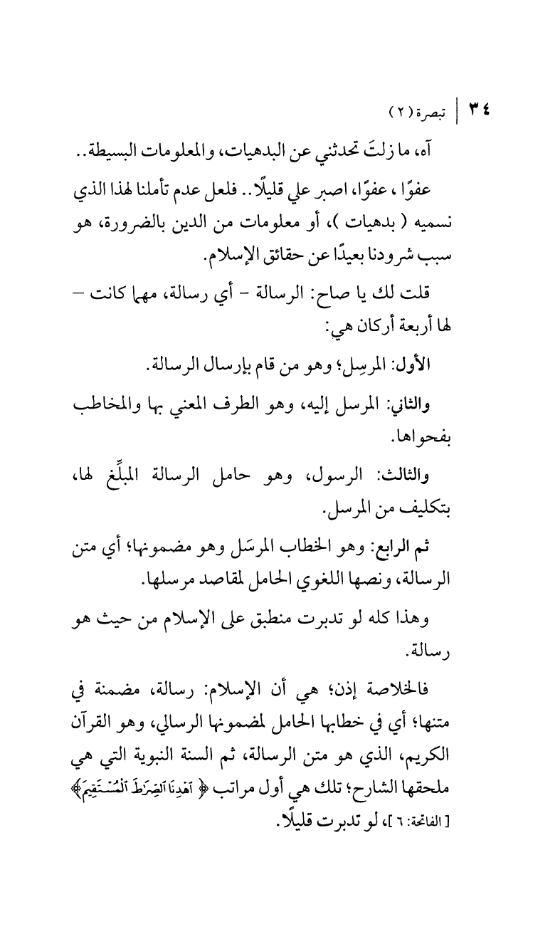 فالخلاصة إذن؛ هي أن الإسلام: رسالة، مضمنة في متنها؛ أي في خطابها الحامل لمضمونها الرسالي، وهو القرآن الكريم، الذي هو متن الرسالة، ثم السنة النبوية التي هي ملحقها الشارح؛ تلك هي أول مراتب {اهْدِنَا الصِّرَاطَ الْمُسْتَقِيمَ} [الفاتحة:6]، لو تدبرت قليلاً.