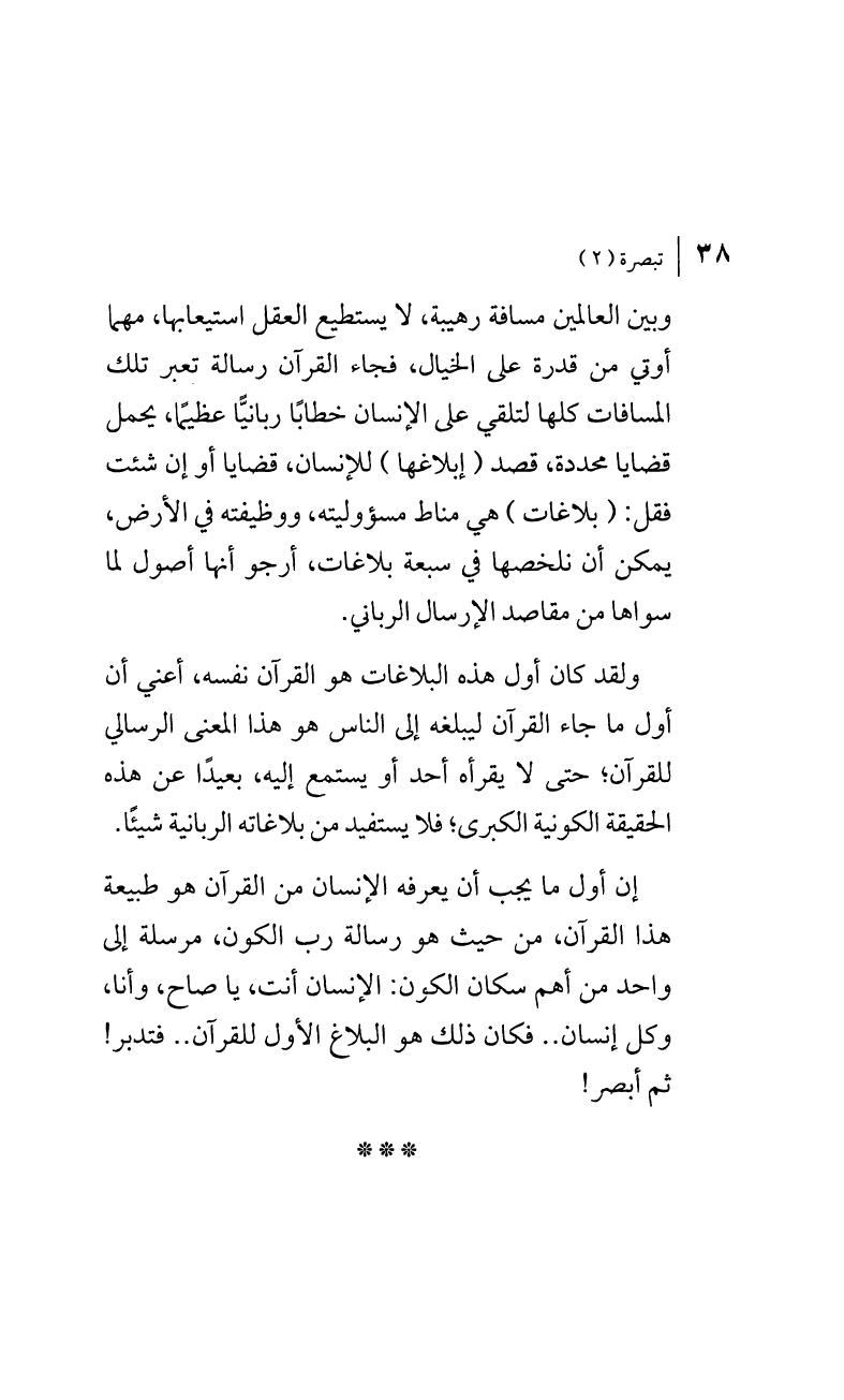 إن أول ما يجب أن يعرفه الإنسان من القرآن هو طبيعة هذا القرآن، من حيث هو رسالة رب الكون، مرسلة إلى واحد من أهم سكان الكون: الإنسان أنت يا صاح، وأنا، وكل إنسان .. فكان ذلك هو البلاغ الأول للقرآن .. فتدبر! ثم أبصر!