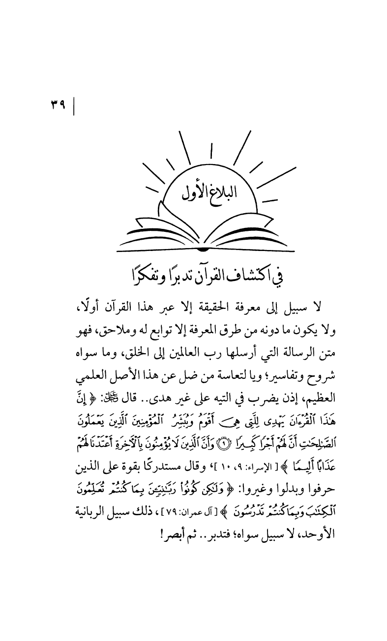 لا سبيل إلى معرفة الحقيقة إلا عبر هذا القرآن أولاً، ولا يكون ما دونه من طرق المعرفة إلا توابع له وملاحق، فهو متن الرسالة، التي أرسلها رب العالمين إلى الخلق، وما سواه شروح وتفاسير؛ ويا لتعاسة من ضل عن هذا الأصل العلمي العظيم، إذن يضرب في التيه على غير هدى .. قال عز وجل: {إِنَّ هَذَا الْقُرْآنَ يِهْدِي لِلَّتِي هِيَ أَقْوَمُ وَيُبَشِّرُ الْمُؤْمِنِينَ الَّذِينَ يَعْمَلُونَ الصَّالِحَاتِ أَنَّ لَهُمْ أَجْرًا كَبِيرًا. وأَنَّ الَّذِينَ لاَ يُؤْمِنُونَ بِالآخِرَةِ أَعْتَدْنَا لَهُمْ عَذَابًا أَلِيمًا} [الإسراء:9،10]، وقال مستدركاً بقوة على الذين حرفوا وبدلوا وغيروا: {وَلَكِن كُونُوا رَبَّانِيِّينَ بِمَا كُنتُمْ تُعَلِّمُونَ الْكِتَابَ وَبِمَا كُنتُمْ تَدْرُسُونَ} [آل عمران:79]. ذلك سبيل الربانية الأوحد، لا سبيل سواه؛ فتدبر .. ثم أبصر!