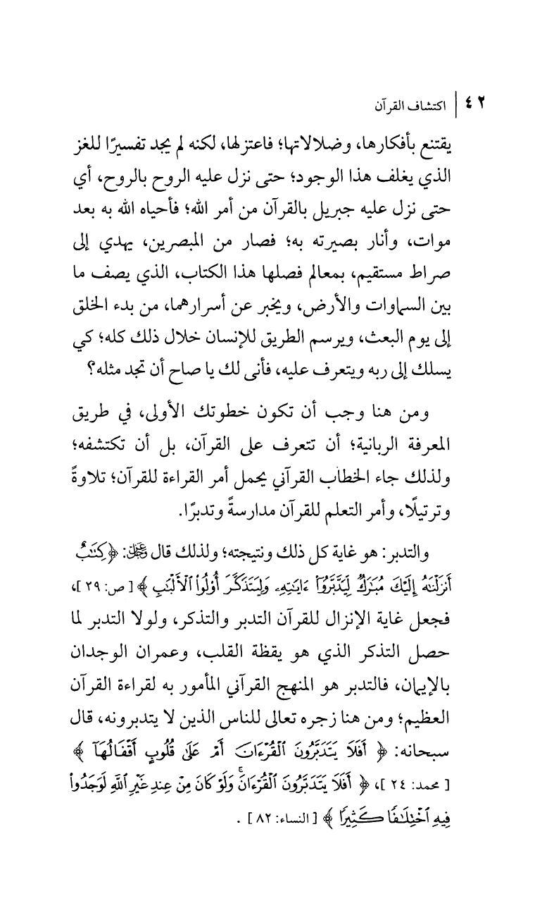 والتدبر هو غاية كل ذلك ونتيجته؛ ولذلك قال عز وجل: {كِتَابٌ أَنزَلْنَاهُ إِلَيْكَ مُبَارَكٌ لِّيَدَّبَّرُوا آيَاتِهِ وَلِيَتَذَكَّرَ أُوْلُوا الْأَلْبَابِ} [سورة ص:29]، فجعل غاية الإنزال للقرآن التدبر والتذكر، ولولا التدبر لما حصل التذكر الذي هو يقظة القلب، وعمران الوجدان بالإيمان، فالتدبر هو المنهج القرآني المأمور به لقراءة القرآن العظيم؛ ومن هنا زجره تعالى للناس الذين لا يتدبرونه. قال سبحانه: {أَفَلَا يَتَدَبَّرُونَ الْقُرْآنَ أَمْ عَلَى قُلُوبٍ أَقْفَالُهَا} [محمد:24]، {أَفَلاَ يَتَدَبَّرُونَ الْقُرْآنَ وَلَوْ كَانَ مِنْ عِندِ غَيْرِ اللهِ لَوَجَدُوا فِيهِ اخْتِلاَفًا كَثِيرًا} [النساء:82].