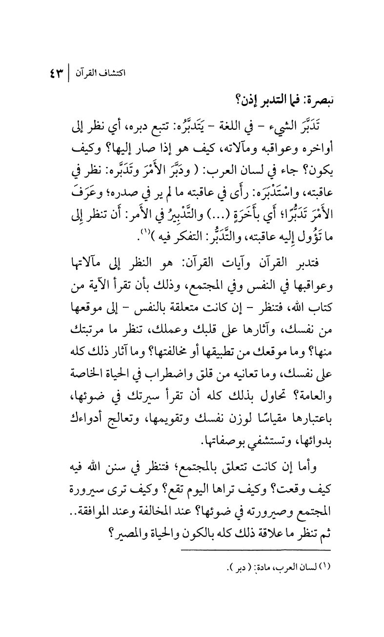تَدَبَّرَ الشيء -في اللغة- يَتَدبَّرُه: تتبع دبره، أي نظر إلى أواخره وعواقبه ومآلاته، كيف هو إذا صار إليها؟ وكيف يكون؟ جاء في لسان العرب: (ودَبَّرَ الأَمْرَ وتَدَبَّره: نظر في عاقبته، واسْتَدْبَرَه: رأَى في عاقبته ما لم ير في صدره؛ وعَرَفَ الأَمْرَ تَدَبُّراً؛ أَي بأَخَرَةٍ (...) والتَّدْبِيرُ في الأَمر: أَن تنظر إِلى ما تَؤُول إِليه عاقبته. والتَّدَبُّر: التفكر فيه) (¬1).