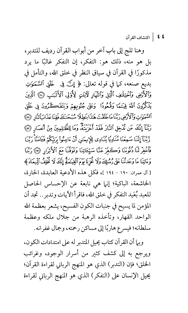 وهنا تلج إلى باب آخر من أبواب القرآن رديف للتدبر، بل هو منه، ذلك هو: التفكر، إن التفكر غالباً ما يرد مذكوراً في القرآن في سياق النظر في خلق الله، والتأمل في بديع صنعه، كما في قوله تعالى: {إِنَّ فِي خَلْقِ السَّمَاوَاتِ وَالأَرْضِ وَاخْتِلاَفِ اللَّيْلِ وَالنَّهَارِ لآيَاتٍ لِّأُوْلِي الألْبَابِ. الَّذِينَ يَذْكُرُونَ اللهَ قِيَامًا وَقُعُودًا وَعَلَىَ جُنُوبِهِمْ وَيَتَفَكَّرُونَ فِي خَلْقِ السَّمَاوَاتِ وَالأَرْضِ رَبَّنَا مَا خَلَقْتَ هَذا بَاطِلاً سُبْحَانَكَ فَقِنَا عَذَابَ النَّارِ. رَبَّنَا إِنَّكَ مَن تُدْخِلِ النَّارَ فَقَدْ أَخْزَيْتَهُ وَمَا لِلظَّالِمِينَ مِنْ أَنصَارٍ. رَّبَّنَا إِنَّنَا سَمِعْنَا مُنَادِيًا يُنَادِي لِلإِيمَانِ أَنْ آمِنُوا بِرَبِّكُمْ فَآمَنَّا رَبَّنَا فَاغْفِرْ لَنَا ذُنُوبَنَا وَكَفِّرْ عَنَّا سَيِّئَاتِنَا وَتَوَفَّنَا مَعَ الأبْرَارِ. رَبَّنَا وَآتِنَا مَا وَعَدتَّنَا عَلَى رُسُلِكَ وَلاَ تُخْزِنَا يَوْمَ الْقِيَامَةِ إِنَّكَ لاَ تُخْلِفُ الْمِيعَادَ} [آل عمران:190،194]، فكل هذه الأدعية العابدة، الحارة، الخاشعة، الباكية؛ إنما هي نابعة عن الإحساس الحاصل للعبد بُعَيد التفكر في خلق الله، فاقرأ الآيات وتدبر .. تجد أن المؤمن لما يسيح في جنبات الكون الفسيح، يشعر بعظمة الله الواحد القهار، وتأخذه الرهبة من جلال ملكه وعظمة سلطانه؛ فيسرع هارباً إلى مساكن رحمته، وجمال غفرانه.