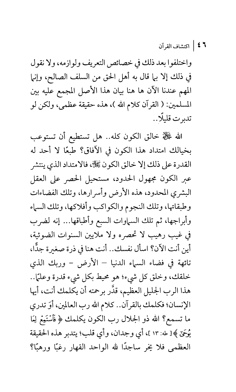 الله جل جلاله خالق الكون كله .. هل تستطيع أن تستوعب بخيالك امتداد هذا الكون في الآفاق؟ طبعاً لا أحد له القدرة على ذلك إلا خالق الكون سبحانه وتعالى، فالامتداد الذي ينتشر عبر الكون مجهول الحدود، مستحيل الحصر على العقل البشري المحدود، هذه الأرض وأسرارها، وتلك الفضاءات وطبقاتها، وتلك النجوم والكواكب وأفلاكها، وتلك السماء وأبراجها، ثم تلك السماوات السبع وأطباقها ... إنه لضرب في غيب رهيب لا تحصره ولا ملايين السنوات الضوئية، أين أنت الآن؟ اسأل نفسك .. أنت هنا في ذرة صغيرة جدّاً، تائهة في فضاء السماء الدنيا –الأرض- وربك الذي خلقك، وخلق كل شيء؛ هو محيط بكل شيء قدرة وعلماً .. هذا الرب الجليل العظيم، قدَّر برحمته أن يكلمك أنت، أيها الإنسان؛ فكلمك بالقرآن .. كلام الله رب العالمين، أوَ تدري ما تسمع؟ الله ذو الجلال رب الكون يكلمك {فَاسْتَمِعْ لِمَا يُوحَى} [طه:13] أي وجدان، وأي قلب؛ يتدبر هذه الحقيقة العظمى فلا يخر ساجداً لله الواحد القهار رغباً ورهباً؟