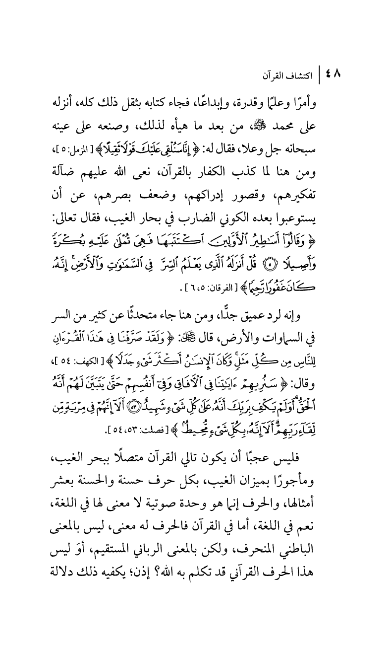 وإنه لرد عميق جدّاً، ومن هنا جاء متحدثاً عن كثير من السر في السماوات والأرض، قال عز وجل: {وَلَقَدْ صَرَّفْنَا فِي هَذَا الْقُرْآنِ لِلنَّاسِ مِن كُلِّ مَثَلٍ وَكَانَ الْإِنسَانُ أَكْثَرَ شَيْءٍ جَدَلاً} [الكهف:54]، وقال: {سَنُرِيهِمْ آيَاتِنَا فِي الْآفَاقِ وَفِي أَنفُسِهِمْ حَتَّى يَتَبَيَّنَ لَهُمْ أَنَّهُ الْحَقُّ أَوَلَمْ يَكْفِ بِرَبِّكَ أَنَّهُ عَلَى كُلِّ شَيْءٍ شَهِيدٌ. أَلَا إِنَّهُمْ فِي مِرْيَةٍ مِّن لِّقَاء رَبِّهِمْ أَلَا إِنَّهُ بِكُلِّ شَيْءٍ مُّحِيطٌ} [فصلت:53،54].