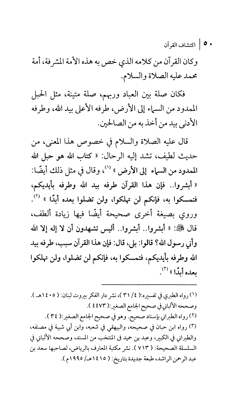 قال عليه الصلاة والسلام في خصوص هذا المعنى، من حديث لطيف، تشد إليه الرحال: «كتاب الله هو حبل الله الممدود من السماء إلى الأرض» (¬1)، وقال في مثل ذلك أيضاً: «أبشروا .. فإن هذا القرآن طرفه بيد الله وطرفه بأيديكم، فتمسكوا به، فإنكم لن تهلكوا، ولن تضلوا بعده أبداً» (¬2). وروي بصيغة أخرى صحيحة أيضاً فيها زيادة ألطف، قال صلى الله عليه وسلم: «أبشروا .. أبشروا .. أليس تشهدون أن لا إله إلا الله وأني رسول الله؟ قالوا: بلى، قال: فإن هذا القرآن سبب، طرفه بيد الله وطرفه بأيديكم، فتمسكوا به، فإنكم لن تضلوا، ولن تهلكوا بعده أبداً» (¬3)