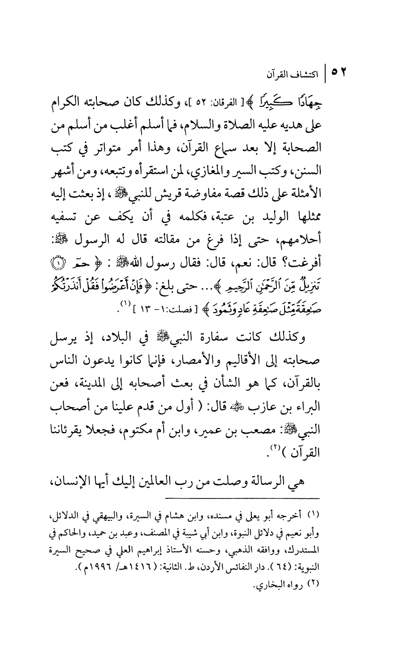 جِهَاداً كَبِيراً} [الفرقان:52] وكذلك كان صحابته الكرام على هديه عليه الصلاة والسلام، فما أسلم أغلب من أسلم من الصحابة إلا بعد سماع القرآن، وهذا أمر متواتر في كتب السنن، وكتب السير والمغازي، لمن استقرأه وتتبعه. ومن أشهر الأمثلة على ذلك قصة مفاوضة قريش للنبي صلى الله عليه وسلم، إذ بعثت إليه ممثلها الوليد بن عتبة، فكلمه في أن يكف عن تسفيه أحلامهم، حتى إذا فرغ من مقالته قال له الرسول صلى الله عليه وسلم: أفرغت؟ قال: نعم، قال: فقال رسول الله صلى الله عليه وسلم: {حم. تَنْزِيلٌ مِنَ الرَّحْمَنِ الرَّحِيمِ} ... حتى بلغ: {فَإِنْ أَعْرَضُوا فَقُلْ أَنْذَرْتُكُمْ صَاعِقَةً مِثْلَ صَاعِقَةِ عَادٍ وَثَمُودَ} [فصلت:1 - 12] (¬1).