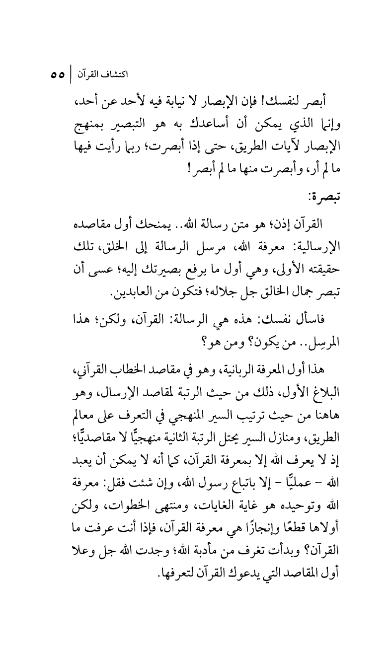 القرآن إذن؛ هو متن رسالة الله .. يمنحك أول مقاصده الإرسالية: معرفة الله، مرسل الرسالة إلى الخلق، تلك حقيقته الأولى، وهي أول ما يرفع بصيرتك إليه؛ عسى أن تبصر جمال الخالق جل جلاله؛ فتكون من العابدين.