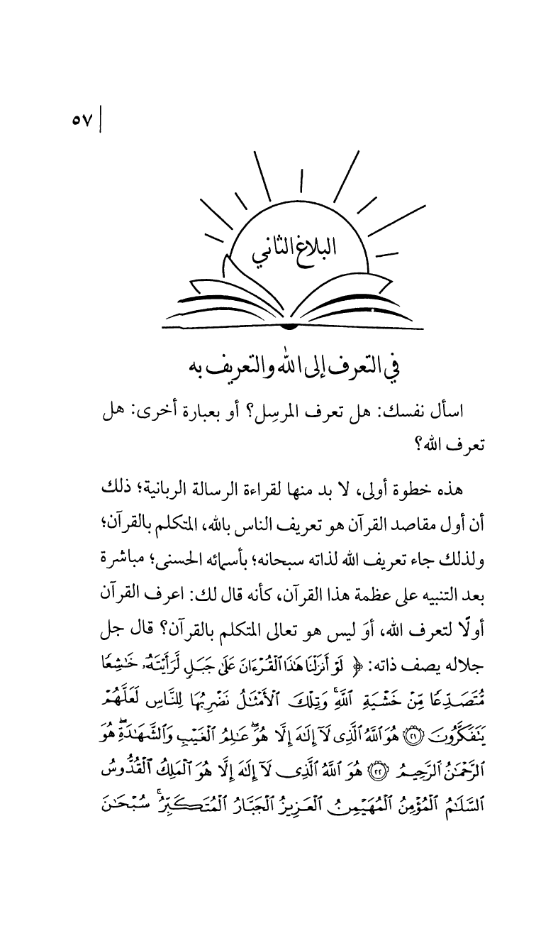 هذه خطوة أولى، لا بد منها لقراءة الرسالة الربانية؛ ذلك أن أول مقاصد القرآن هو تعريف الناس بالله، المتكلم بالقرآن؛ ولذلك جاء تعريف الله لذاته سبحانه؛ بأسمائه الحسنى؛ مباشرة بعد التنبيه على عظمة هذا القرآن، كأنه قال لك: اعرف القرآن أولاً لتعرف الله، أوَ ليس هو تعالى المتكلم بالقرآن؟ قال جل جلاله يصف ذاته: {لَوْ أَنزَلْنَا هَذَا الْقُرْآنَ عَلَى جَبَلٍ لَّرَأَيْتَهُ خَاشِعًا مُّتَصَدِّعًا مِّنْ خَشْيَةِ اللَّهِ وَتِلْكَ الْأَمْثَالُ نَضْرِبُهَا لِلنَّاسِ لَعَلَّهُمْ يَتَفَكَّرُونَ. هُوَ اللَّهُ الَّذِي لَا إِلَهَ إِلَّا هُوَ عَالِمُ الْغَيْبِ وَالشَّهَادَةِ هُوَ الرَّحْمَنُ الرَّحِيمُ. هُوَ اللَّهُ الَّذِي لَا إِلَهَ إِلَّا هُوَ الْمَلِكُ الْقُدُّوسُ السَّلَامُ الْمُؤْمِنُ الْمُهَيْمِنُ الْعَزِيزُ الْجَبَّارُ الْمُتَكَبِّرُ سُبْحَانَ