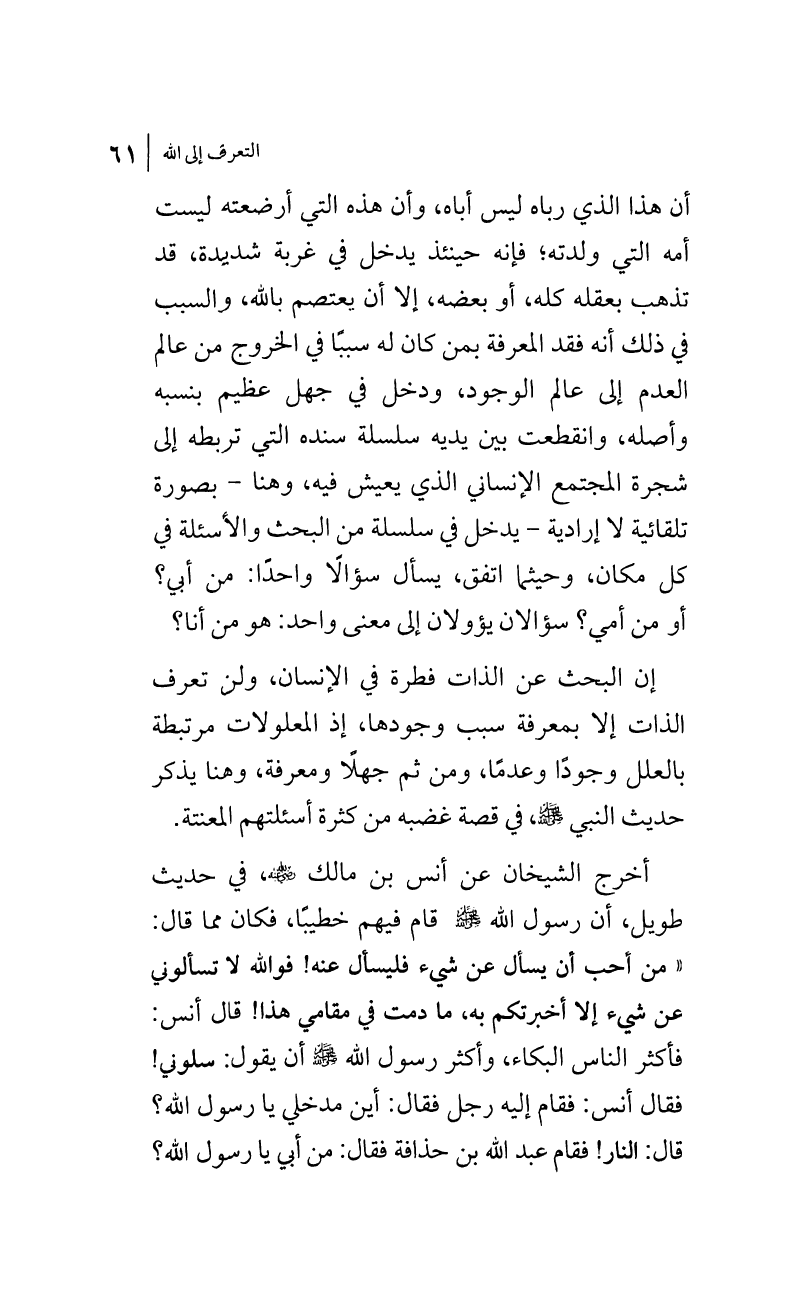 إن البحث عن الذات فطرة في الإنسان، ولن تعرف الذات إلا بمعرفة سبب وجودها، إذ المعلولات مرتبطة بالعلل وجوداً وعدماً، ومن ثم جهلاً ومعرفة. وهنا يذكر حديث النبي صلى الله عليه وسلم، في قصة غضبه من كثرة أسئلتهم المعنتة.