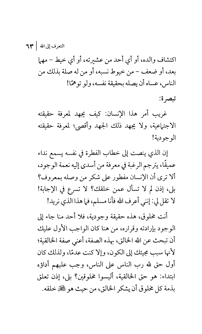 إن الذي ينصت إلى خطاب الفطرة في نفسه يسمع نداء عميقاً، يترجم الرغبة في معرفة من أسدى إليه نعمة الوجود، ألا ترى أن الإنسان مفطور على شكر من وصله بمعروف؟ بلى، إذن لم لا تسأل عمن خلقك؟ لا تسرع في الإجابة! لا تقل لي: إنني أعرف الله فأنا مسلم، فما هذا الذي نريد!