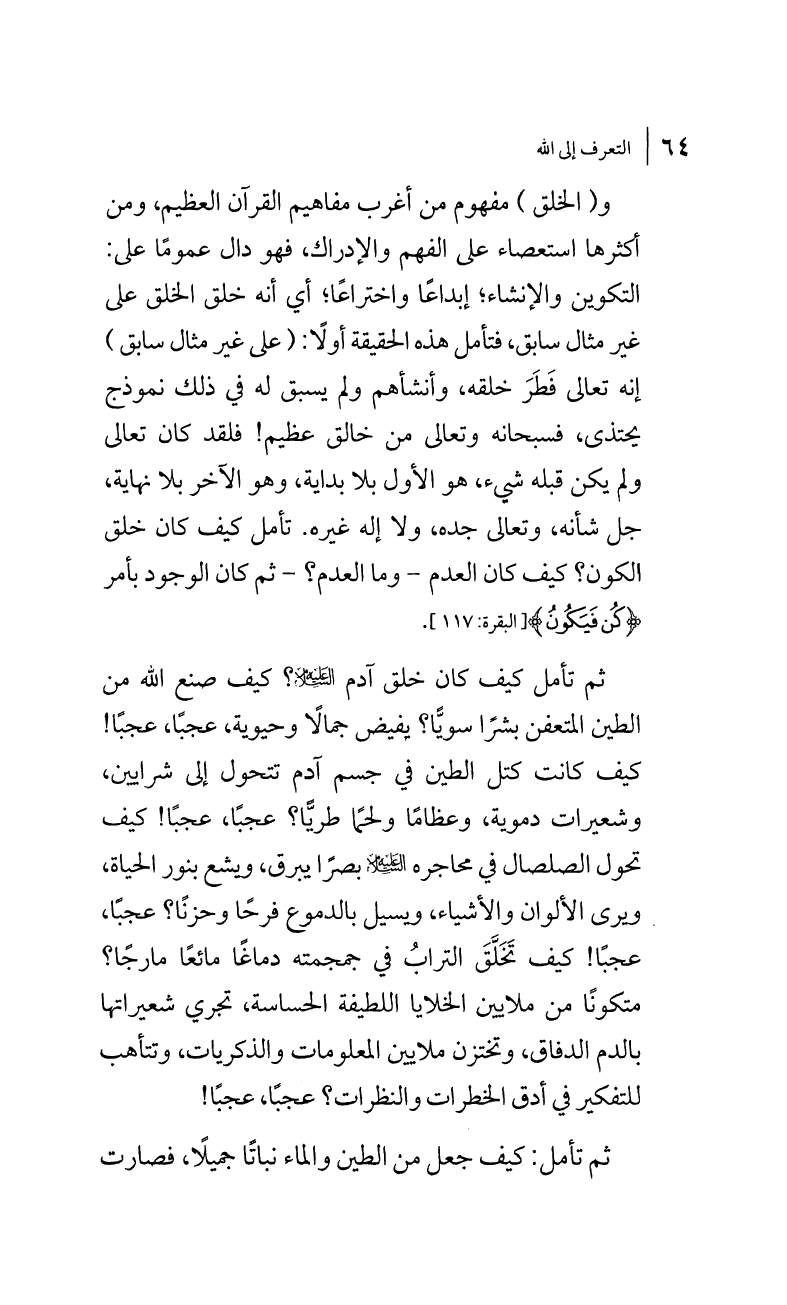 ثم تأمل كيف كان خلق آدم عليه السلام؟ كيف صنع الله من الطين المتعفن بشراً سويّاً؟ يفيض جمالاً وحيوية، عجباً، عجباً! كيف كانت كتل الطين في جسم آدم تتحول إلى شرايين، وشعيرات دموية، وعظاماً ولحماً طريّاً؟ عجباً، عجباً! كيف تحول الصلصال في محاجره عليه السلام بصراً يبرق، ويشع بنور الحياة، ويرى الألوان والأشياء، ويسيل بالدموع فرحاً وحزناً؟ عجباً، عجباً! كيف تَخَلَّقَ الترابُ في جمجمته دماغاً مائعاً مارجاً؟ متكوناً من ملايين الخلايا اللطيفة الحساسة، تجري شعيراتها بالدم الدفاق، وتختزن ملايين المعلومات والذكريات، وتتأهب للتفكير في أدق الخطرات والنظرات؟ عجباً، عجباً!