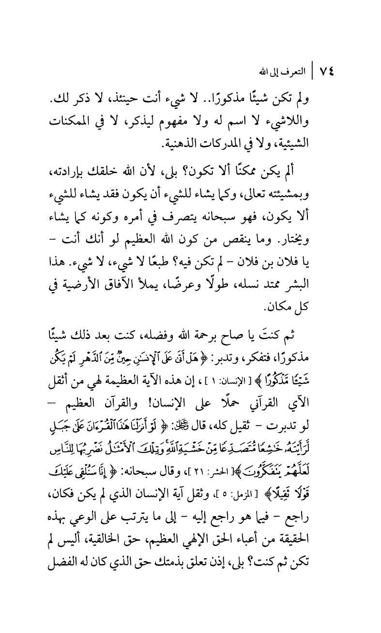 ثم كنتَ يا صاح برحمة الله وفضله، كنت بعد ذلك شيئاً مذكوراً، فتفكر، وتدبر: {هَلْ أَتَى عَلَى الْإِنْسَانِ حِينٌ مِنَ الدَّهْرِ لَمْ يَكُنْ شَيْئًا مَذْكُورًا} [الإنسان:1]، إن هذه الآية العظيمة لهي من أثقل الآي القرآني حملاً على الإنسان! والقرآن العظيم -لو تدبرت- ثقيل كله، قال عز وجل: {لَوْ أَنزَلْنَا هَذَا الْقُرْآنَ عَلَى جَبَلٍ لَّرَأَيْتَهُ خَاشِعًا مُّتَصَدِّعًا مِّنْ خَشْيَةِ اللَّهِ وَتِلْكَ الْأَمْثَالُ نَضْرِبُهَا لِلنَّاسِ لَعَلَّهُمْ يَتَفَكَّرُونَ} [الحشر:21]، وقال سبحانه: {إِنَّا سَنُلْقِي عَلَيْكَ قَوْلًا ثَقِيلًا} [المزمل:5]، وثقل آية الإنسان الذي لم يكن فكان، راجع -فيما هو راجع إليه- إلى ما يترتب على الوعي بهذه الحقيقة من أعباء الحق الإلهي العظيم، حق الخالقية، أليس لم تكن ثم كنت؟ بلى، إذن تعلق بذمتك حق الذي كان له الفضل