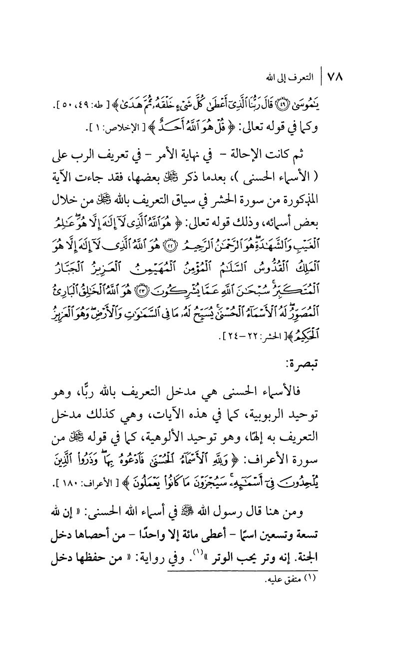 ثم كانت الإحالة -في نهاية الأمر- في تعريف الرب على (الأسماء الحسنى)، بعدما ذكر عز وجل بعضها، فقد جاءت الآية المذكورة من سورة الحشر في سياق التعريف بالله عز وجل من خلال بعض أسمائه، وذلك قوله تعالى: {هُوَ اللَّهُ الَّذِي لَا إِلَهَ إِلَّا هُوَ عَالِمُ الْغَيْبِ وَالشَّهَادَةِ هُوَ الرَّحْمَنُ الرَّحِيمُ. هُوَ اللَّهُ الَّذِي لَا إِلَهَ إِلَّا هُو الْمَلِكُ الْقُدُّوسُ السَّلَامُ الْمُؤْمِنُ الْمُهَيْمِنُ الْعَزِيزُ الْجَبَّارُ الْمُتَكَبِّرُ سُبْحَانَ اللَّهِ عَمَّا يُشْرِكُونَ. هُوَ اللَّهُ الْخَالِقُ الْبَارِئُ الْمُصَوِّرُ لَهُ الْأَسْمَاءُ الْحُسْنَى يُسَبِّحُ لَهُ مَا فِي السَّمَاوَاتِ وَالْأَرْضِ وَهُوَ الْعَزِيزُ الْحَكِيمُ} [لحشر:22 - 24].