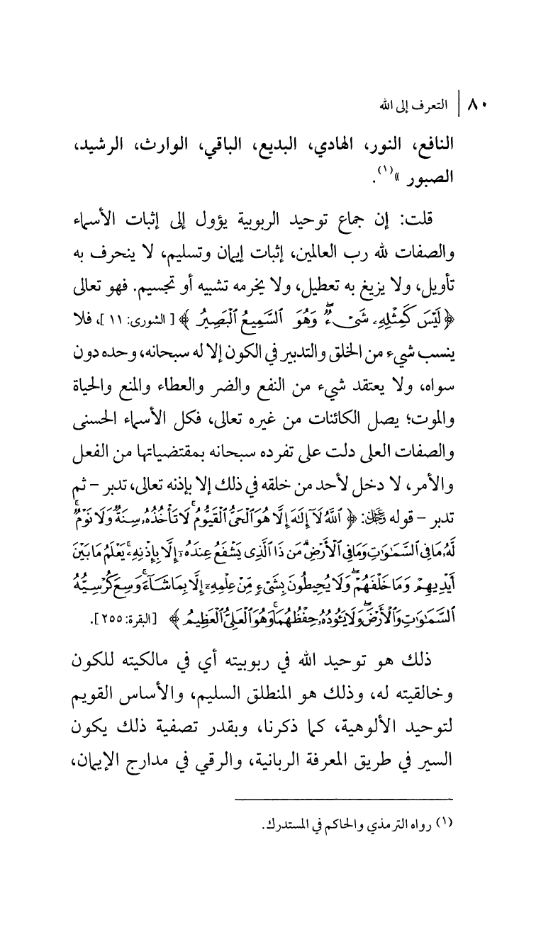 ذلك هو توحيد الله في ربوبيته أي في مالكيته للكون وخالقيته له، وذلك هو المنطلق السليم، والأساس القويم لتوحيد الألوهية، كما ذكرنا، وبقدر تصفية ذلك يكون السير في طريق المعرفة الربانية، والرقي في مدارج الإيمان،
