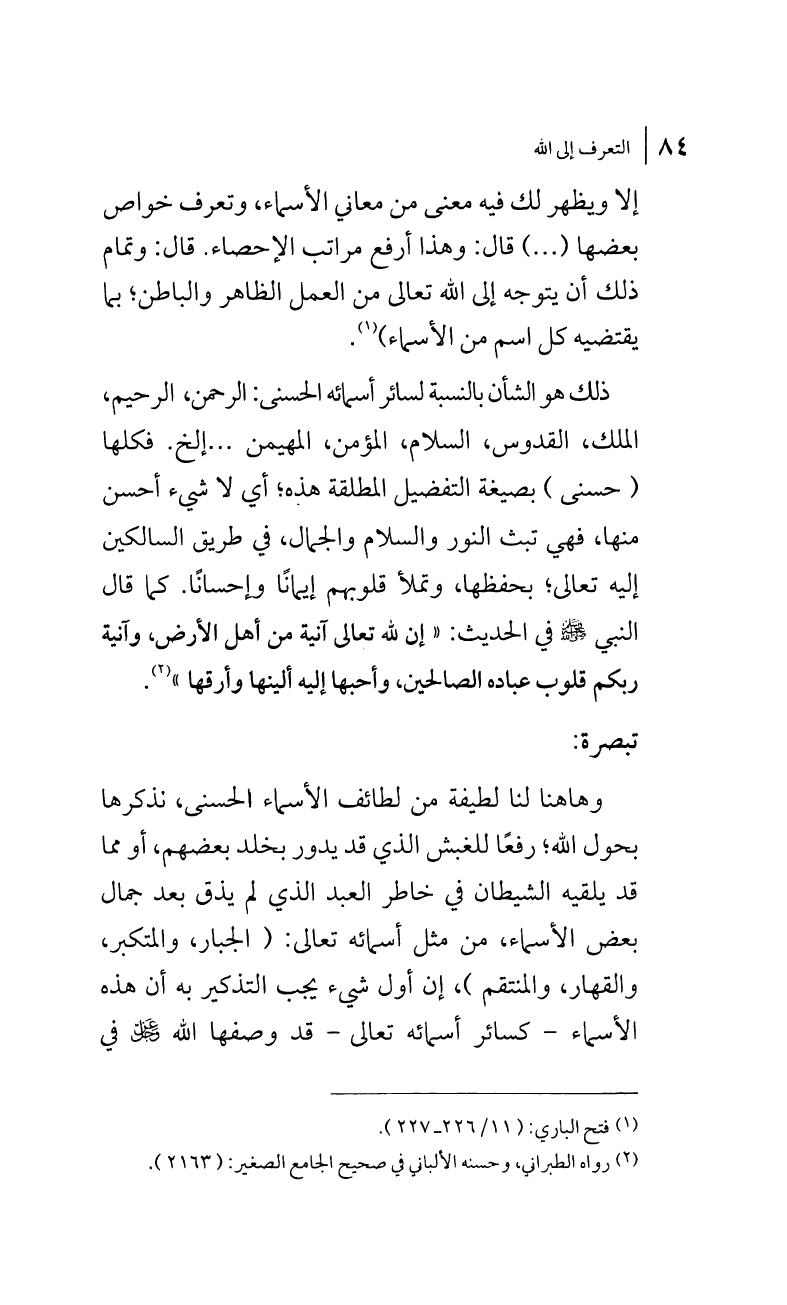 إلا ويظهر لك فيه معنى من معاني الأسماء، وتعرف خواص بعضها (...) قال: وهذا أرفع مراتب الإحصاء. قال: وتمام ذلك أن يتوجه إلى الله تعالى من العمل الظاهر والباطن؛ بما يقتضيه كل اسم من الأسماء) (¬1).