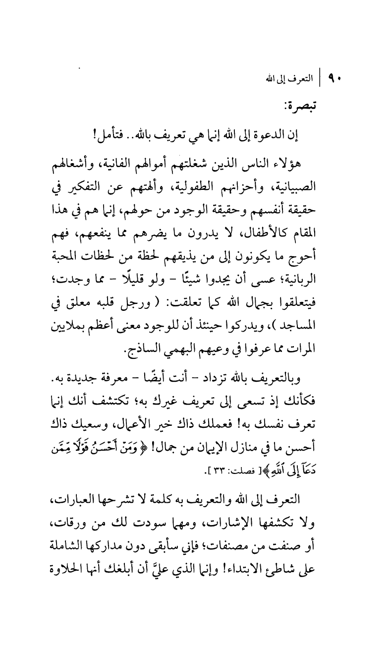 التعرف إلى الله والتعريف به كلمة لا تشرحها العبارات، ولا تكشفها الإشارات، ومهما سودت لك من ورقات، أو صنفت من مصنفات؛ فإني سأبقى دون مداركها الشاملة على شاطئ الابتداء! وإنما الذي عليَّ أن أبلغك أنها الحلاوة