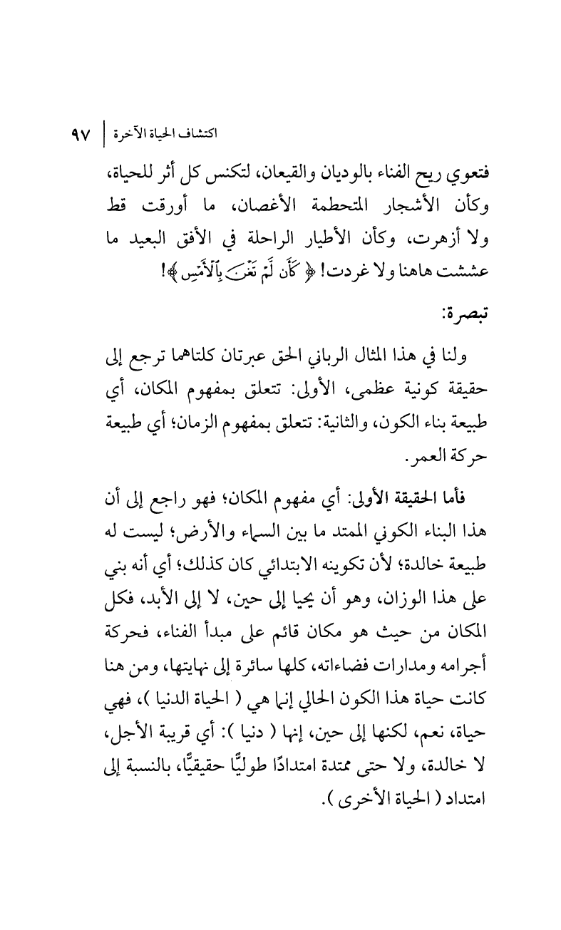 فأما الحقيقة الأولى: أي مفهوم المكان؛ فهو راجع إلى أن هذا البناء الكوني الممتد ما بين السماء والأرض؛ ليست له طبيعة خالدة؛ لأن تكوينه الابتدائي كان كذلك؛ أي أنه بني على هذا الوزان، وهو أن يحيا إلى حين، لا إلى الأبد، فكل المكان من حيث هو مكان قائم على مبدأ الفناء، فحركة أجرامه ومدارات فضاءاته، كلها سائرة إلى نهايتها، ومن هنا كانت حياة هذا الكون الحالي إنما هي (الحياة الدنيا)، فهي حياة، نعم، لكنها إلى حين، إنها (دنيا): أي قريبة الأجل، لا خالدة، ولا حتى ممتدة امتداداً طوليّاً حقيقيّاً، بالنسبة إلى امتداد (الحياة الأخرى).
