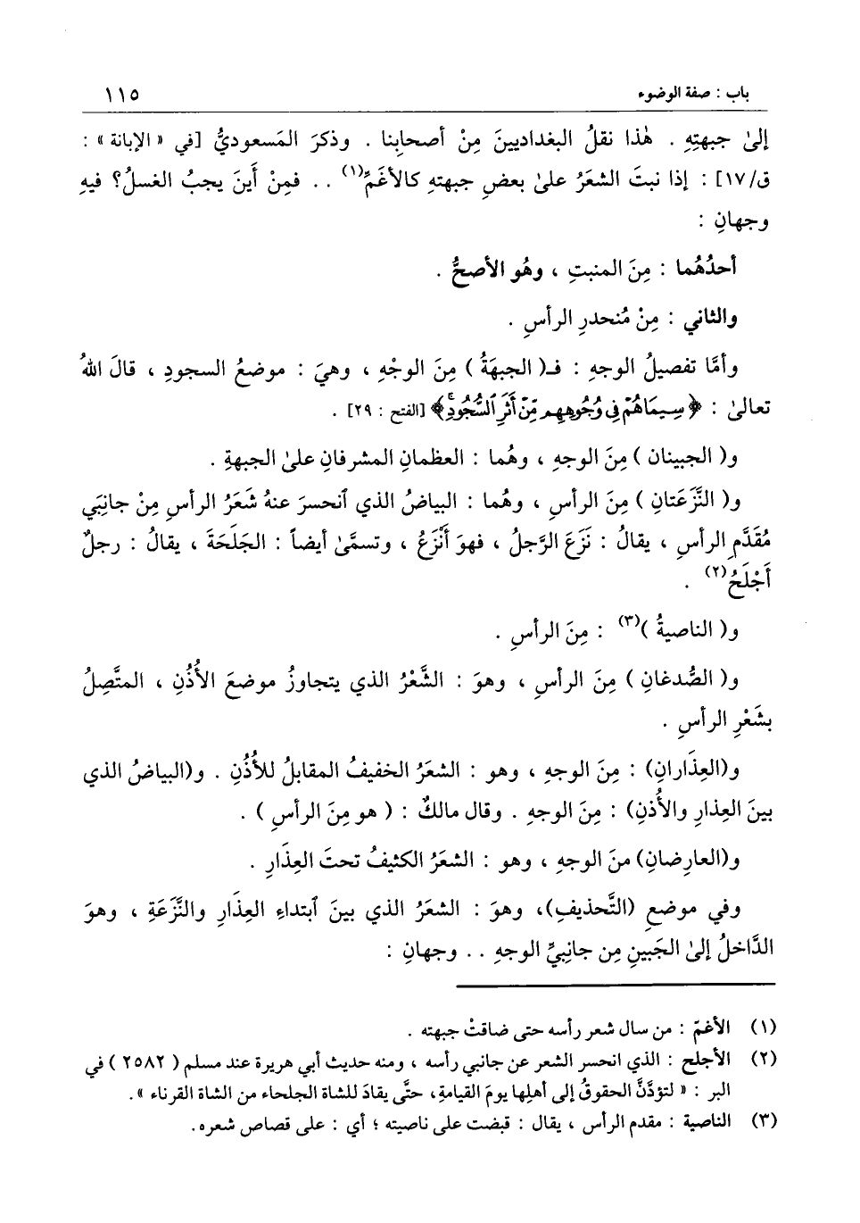 وأما تفصيل الوجه: فـ (الجبهة) من الوجه، وهي: موضع السجود، قال الله تعالى: {سِيمَاهُمْ فِي وُجُوهِهِمْ مِنْ أَثَرِ السُّجُودِ} [الفتح: 29] [الفتح: 29] .
