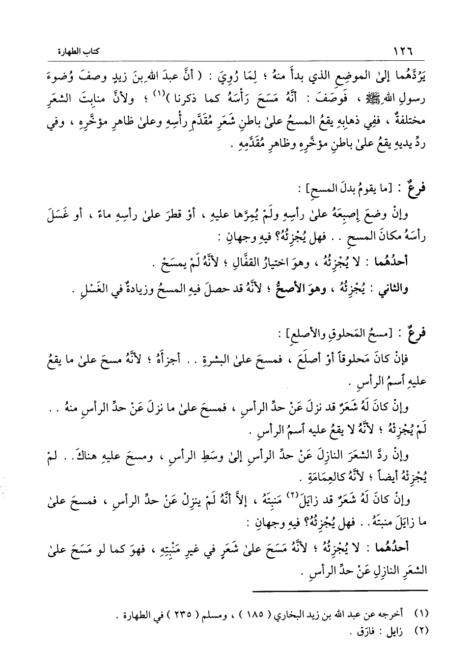 يردهما إلى الموضع الذي بدأ منه؛ لما روي: (أن عبد الله بن زيد وصف وضوء رسول الله - صَلَّى اللَّهُ عَلَيْهِ وَسَلَّمَ -، فوصف: أنه مسح رأسه كما ذكرنا) ؛ ولأن منابت الشعر مختلفة، ففي ذهابه يقع المسح على باطن شعر مقدم رأسه وعلى ظاهر مؤخره، وفي رد يديه يقع على باطن مؤخره وظاهر مقدمه.