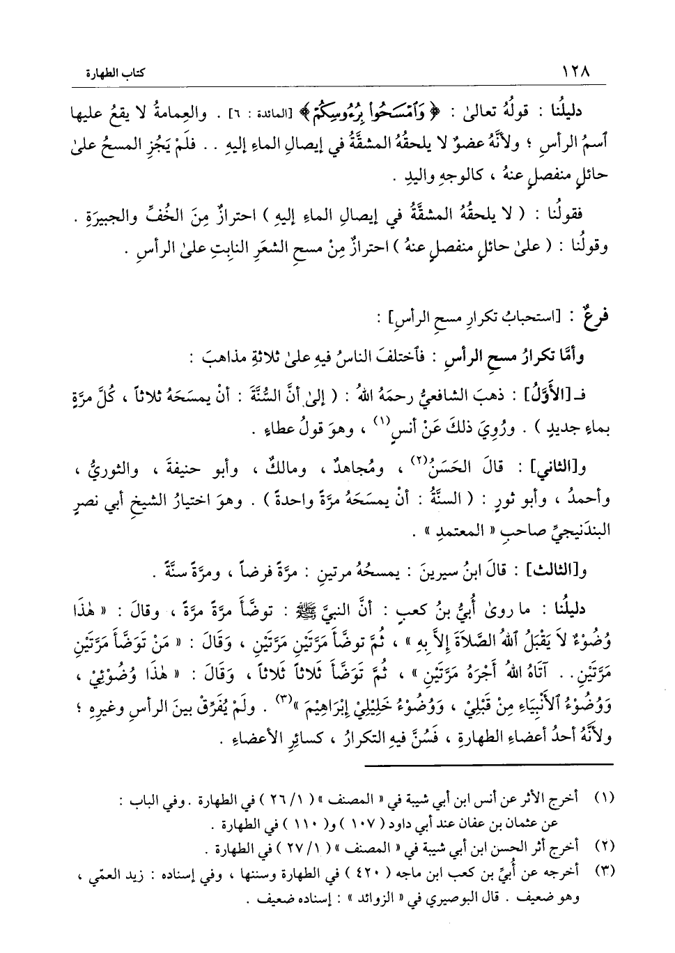 دليلنا: ما روى أبي بن كعب: «أن النبي - صَلَّى اللَّهُ عَلَيْهِ وَسَلَّمَ -: توضأ مرة مرة، وقال: "هذا وضوء لا يقبل الله الصلاة إلا به"، ثم توضأ مرتين مرتين، وقال: "من توضأ مرتين مرتين.. آتاه الله أجره مرتين"، ثم توضأ ثلاثًا ثلاثًا، وقال: "هذا وضوئي، ووضوء الأنبياء من قبلي، ووضوء خليلي إبراهيم» . ولم يفرق بين الرأس وغيره؛ ولأنه أحد أعضاء الطهارة، فسن فيه التكرار، كسائر الأعضاء.