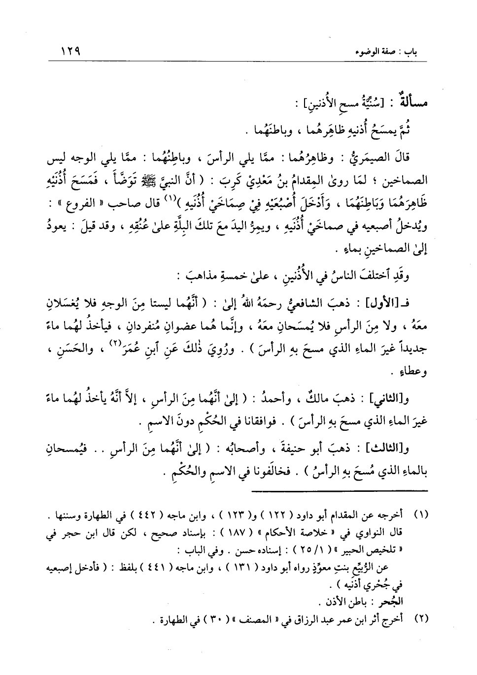 قال الصيمري: وظاهرهما: مما يلي الرأس، وباطنهما: مما يلي الوجه ليس الصماخين؛ لما روى المقدام بن معدي كرب: «أن النبي - صَلَّى اللَّهُ عَلَيْهِ وَسَلَّمَ - توضأ، فمسح أذنيه ظاهرهما وباطنهما، وأدخل أصبعيه في صماخي أذنيه» قال صاحب " الفروع ": ويدخل أصبعيه في صماخي أذنيه، ويمر اليد مع تلك البلة على عنقه، وقد قيل: يعود إلى الصماخين بماء.